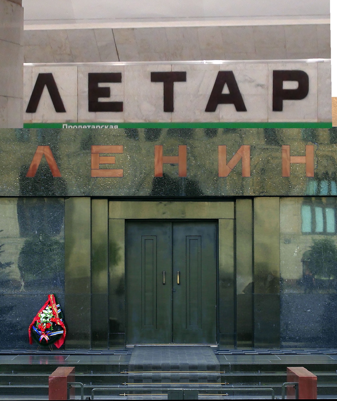 Случайно пересматривая какие-то советские хроники на ютьюбе, увидел мавзолей. Тут-то сразу и сработала ассоциация. Тот же шрифт и материал надписи - камень. Более того, таким же камнем как буквы мавзолея, облицованы наклонные плоскости Пролетарской (розоватый).