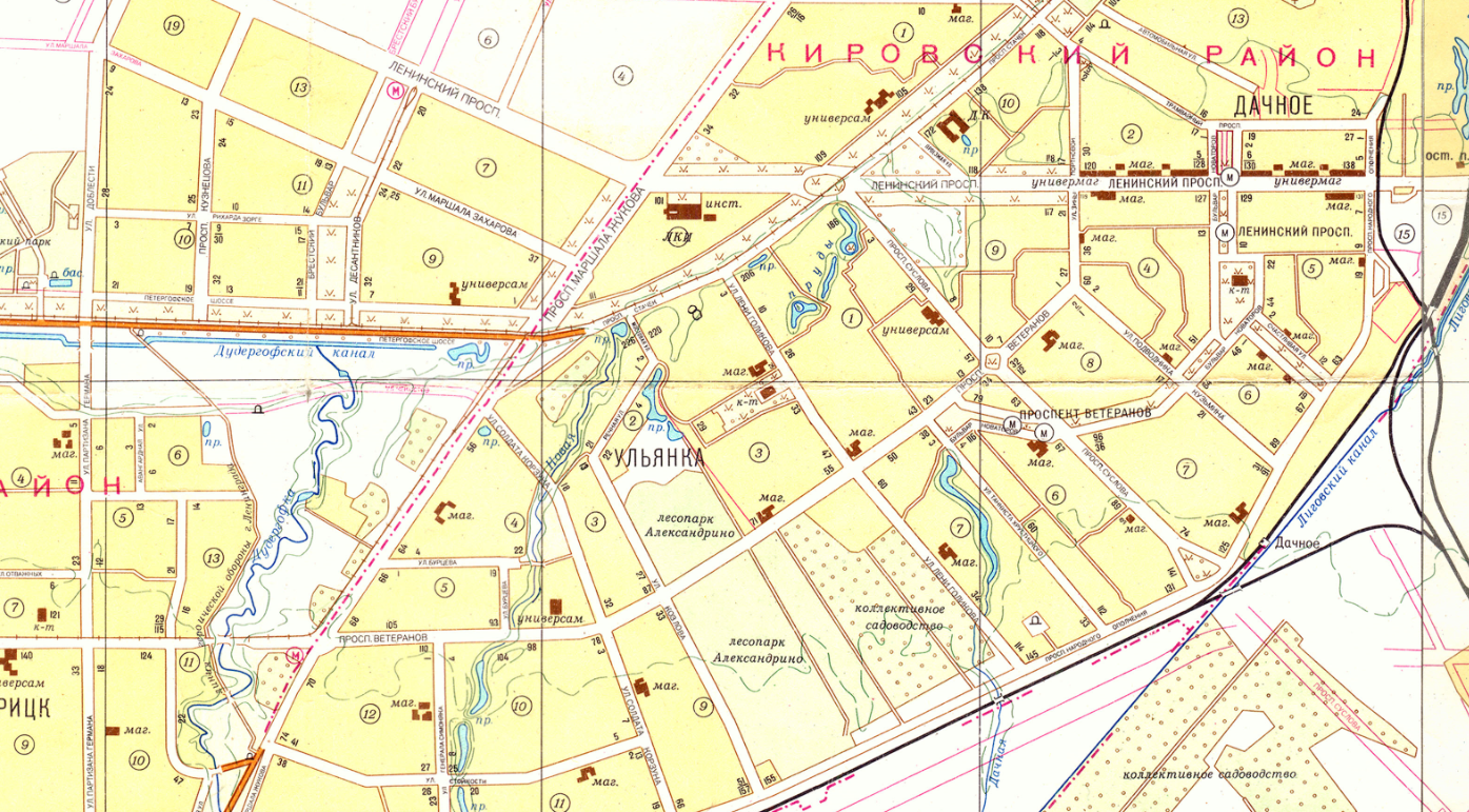 А вот криншот Генерального развития Ленинграда 1988 года с интересующей нас частью города. Вижу только две перспективные станции здесь: угол Ветеранов и Жукова; угол Ленинского и Десантников