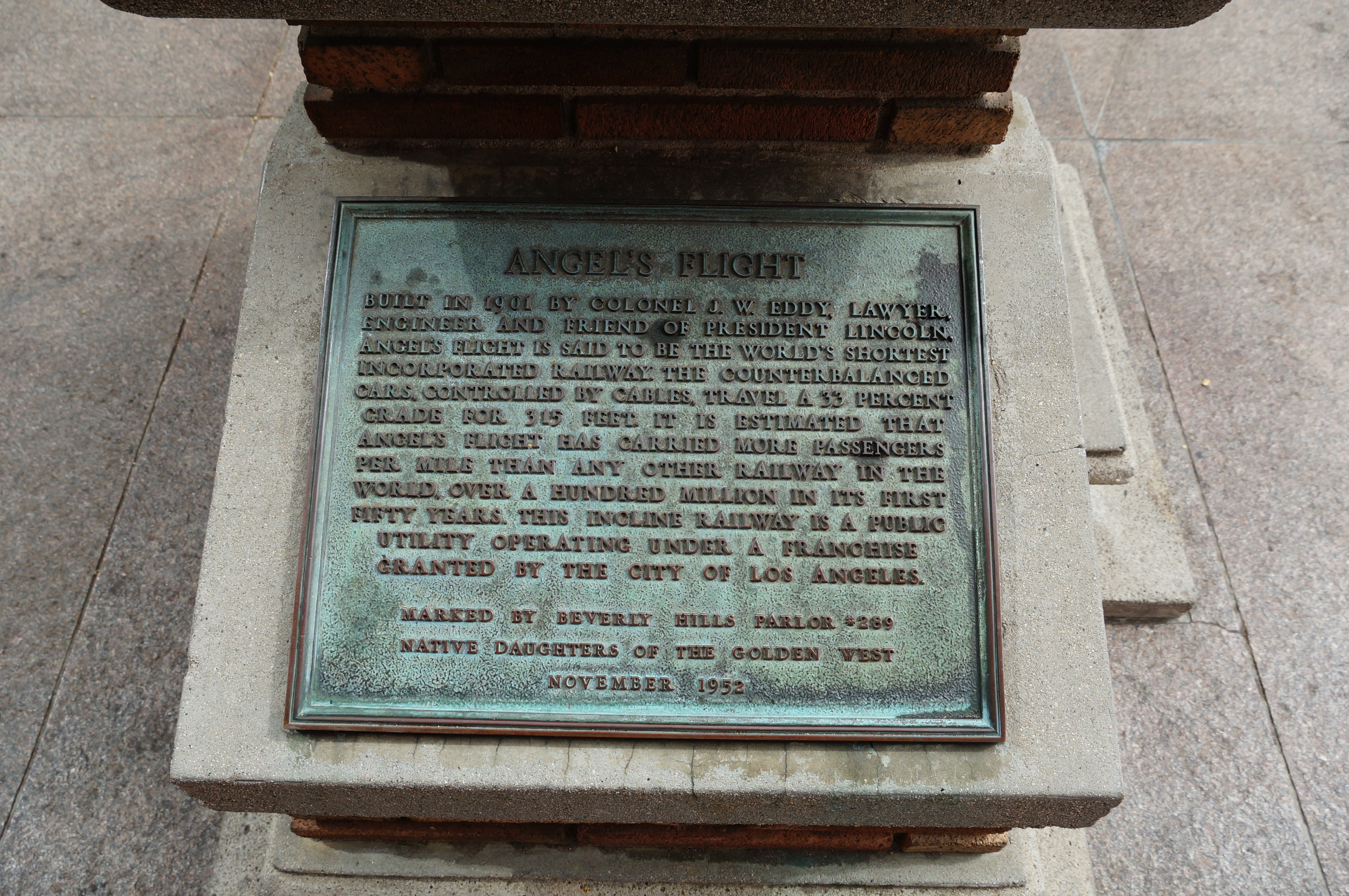 Я предполагал, что может возникнуть такой вопрос. Поэтому я сфоткал табличку у верхней станции. На ней есть фраза "Angels Flight is said to be the world's shоrtest incorporated railway the counterbalanced cars, controlled by cables...".