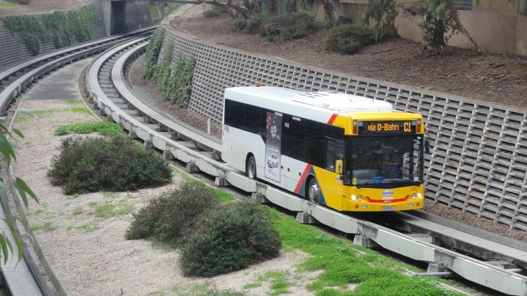 Самая лучшая реализация выделенного автобуса - направляющий автобус. Называется O-Bahn. Данная система находится в Аделаиде. При движении по специальной трассе ведут направляющие колёсики, при движении по обычной трассе - без них.