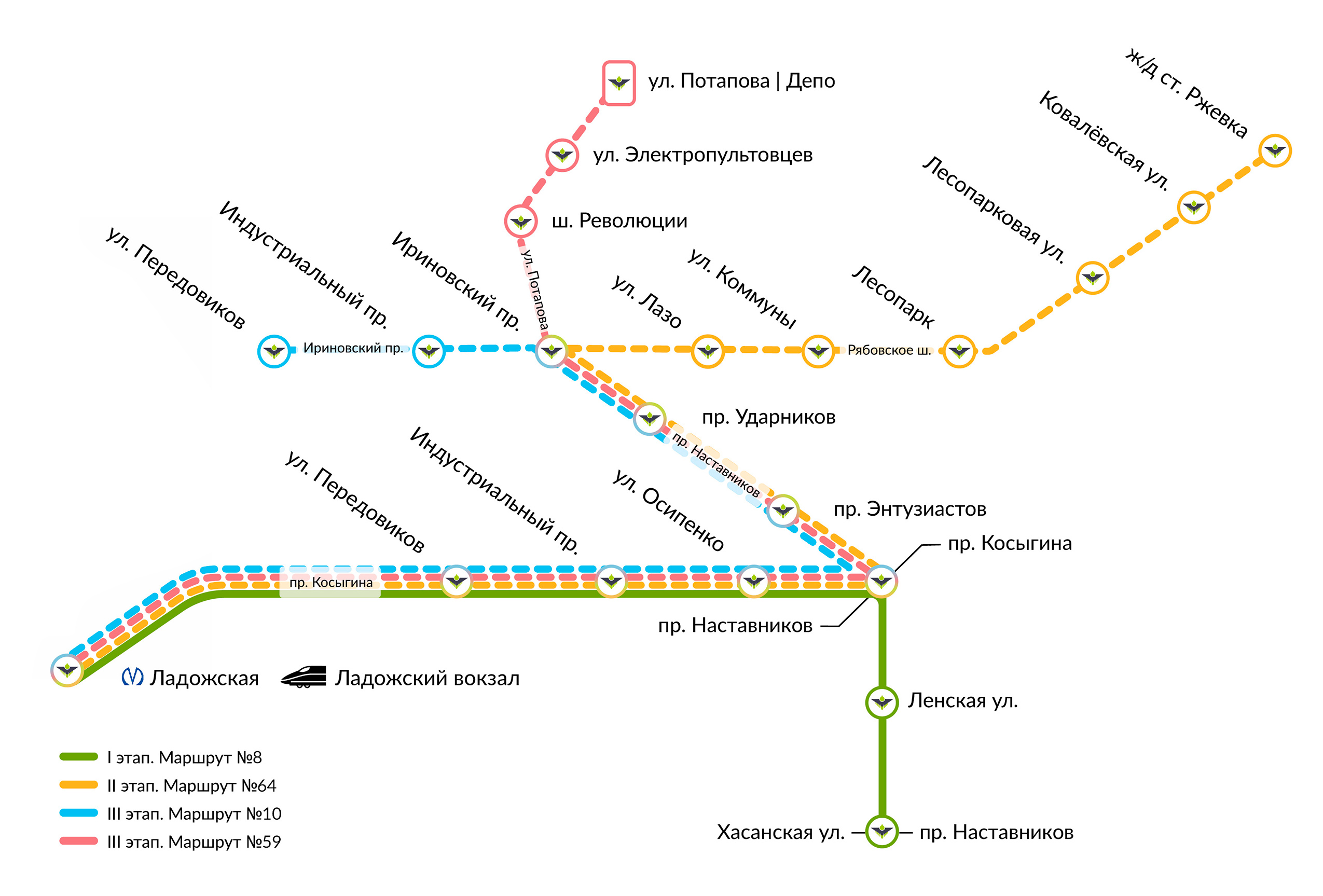 Эм. Вы вообще следите за ситуацией или просто что-то где-то краем уха слышали? Во-первых, какие огромные отставания по срокам? Да, они есть, но к концу года (а скорее всего к декабрю) могут запустить 64а от Ладожской до Ириновского. Во-вторых, остановку у Ладожской вернут под вокзал (почти все рельсы там уже в бетоне), так что два маршрута смогут спокойно оборачиваться. В-третьих, по Ириновскому и Ржевки. пока планируется, что на Ржевку будет ходить 64-ый от ТКК и 30-ка от ГЭТ. 30-ка планируется по маршруту нынешней 10-ки. И по срокам - если город с ГЭТом тупить не будут и быстро вывезут своё кривое барахло, то за 2019-ый должны сделать пути по Ириновскому и на Ржевку. Там планируется только реконструкция путей, в то время как на Наставников еще и дорогу реконструируют. Больше всего опасений пока вызывает путь к депо на Потапова.