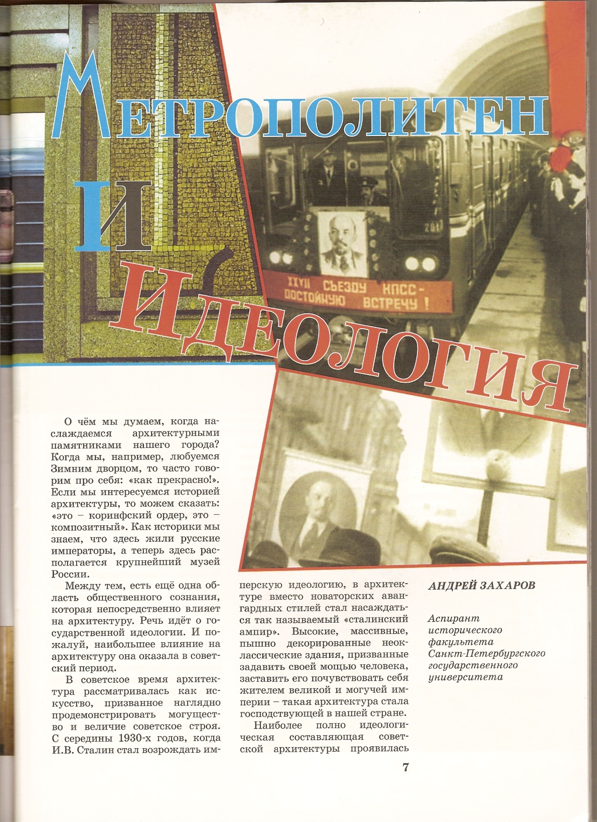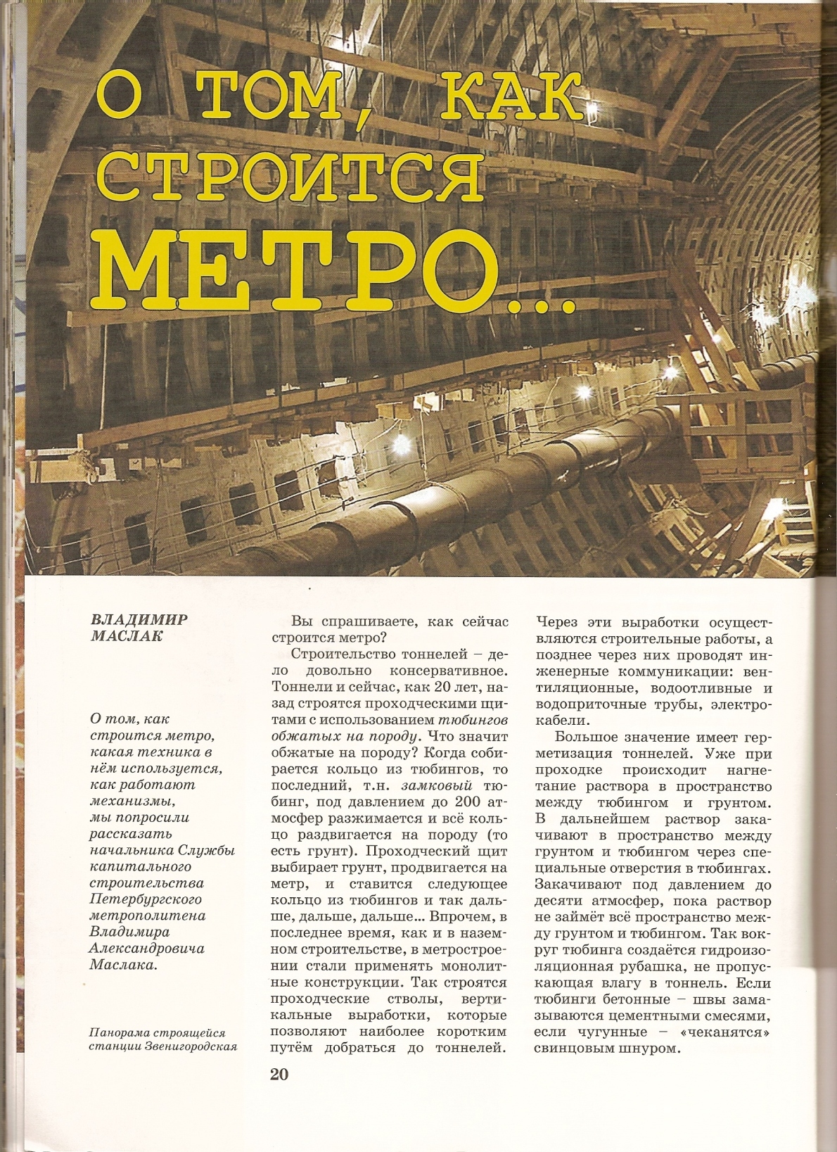 Отсканил этот номер журнала, потом в поиске наткнулся на данную тему. Ну, поскольку сканов тут нет, то выкладываю свои. Есть статья об идеологии в оформлении первых станций, статья с перечислением материалов, использованных в отделке станций. Интересна статья одного из авторов станции «Площадь Александра Невского –2» Л.П. Лаврова об истории проектирования и строительства этой и других станций. Например, о требовании авторов «Гостиного двора» соорудить 4 ленты эскалаторов, о проблемах, возникших при облицовке «Маяковской». Также затронута проблема изменения облика: замена изначальных плафонов, спроектированных специально для «ПЛАНа» и изготовленных с запасом по количеству, на стандартные.