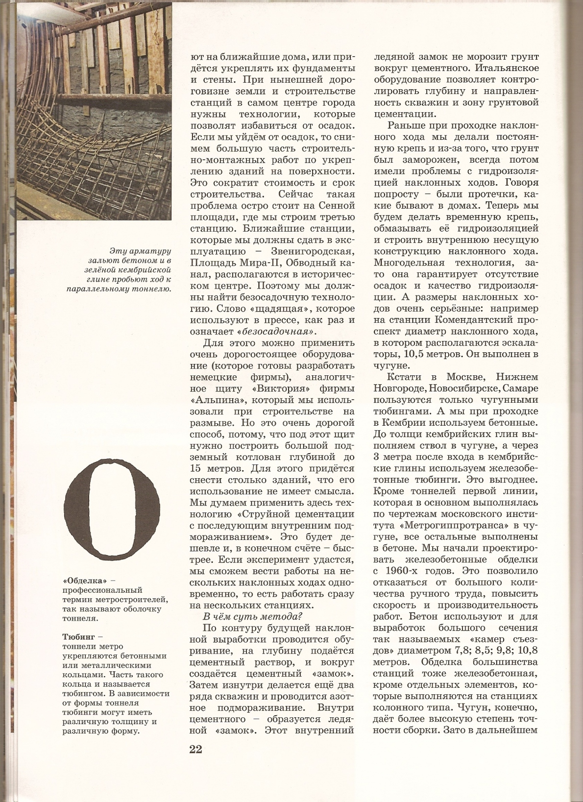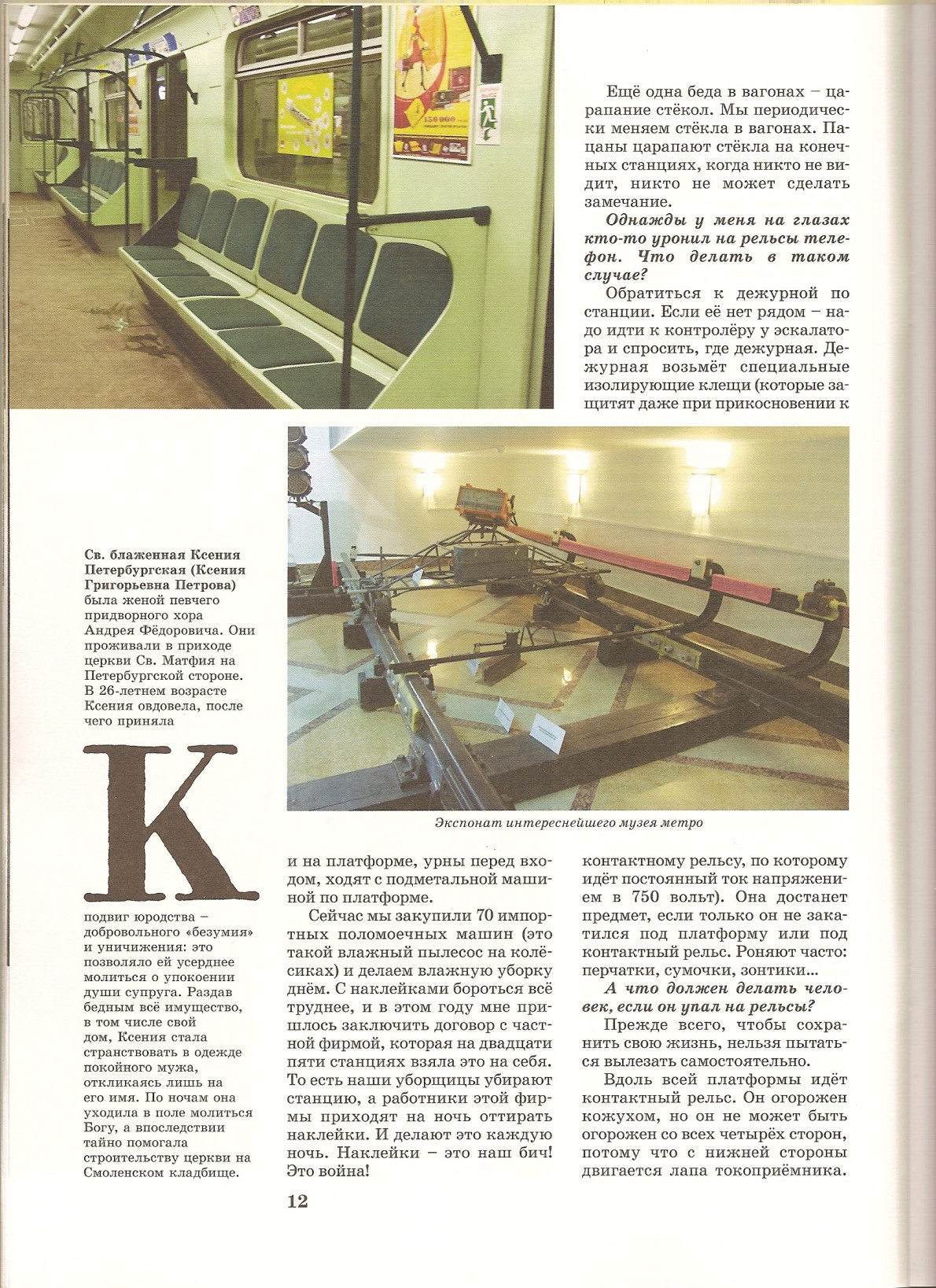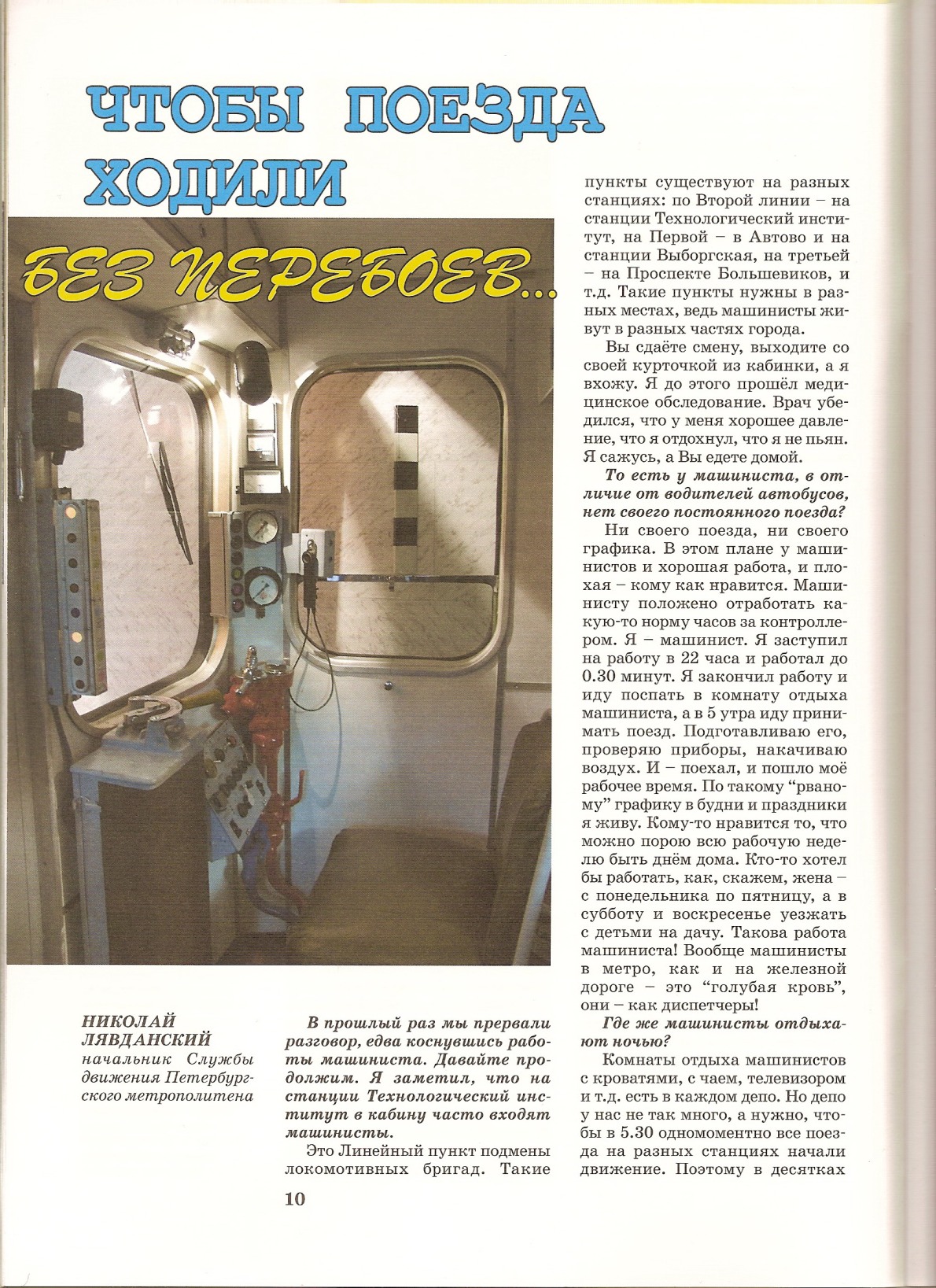 Продолжение интервью с Н.Л. Лявданским, начальником Службы движения Петербургского метрополитена (начало - в номере, выложенном выше). Удивительно, что действующий начальник метрополитеновской службы довольно критично высказался о современном качестве строительства, об облицовке станций «пластиком», о замене малых эскалаторов лестницами. Также в журнале опубликована статья художника И.Г. Уралова, входящего в коллектив художников ФоРУС. Интересен момент, о том, что из-за мозаик «Улицы Дыбенко» художникам пришлось общаться с «ответственными лицами», которые обвиняли их в троцкизме! И приведено описание первоначального остроумного проекта центральной мозаики для этой станции, который воплотить в жизнь не разрешили. Также Уралов затронул тему вандализма. К вандализму он отнёс также размещение рекламы и торговли в метро. Причём такой вандализм он счёл ещё более опасным, чем «разукрашивание» стен краской. Интересно, что он думает о НИПе...