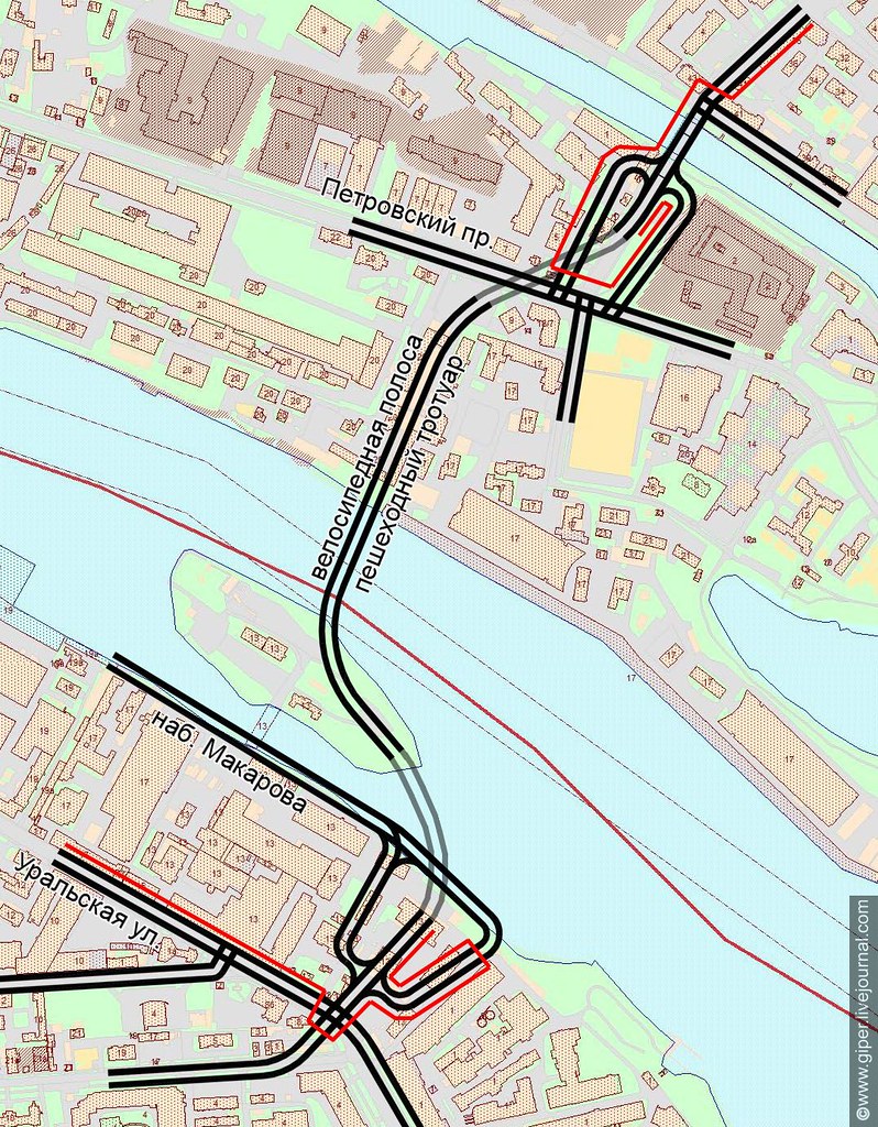 Недавно заметил, что с Большого проспекта П.С. (по правой части) на Тучков мост не попасть. Для этого нужно свернуть направо и вуаля - перейти через 2 светофора по правилам. Потому что Ждановскую улицу в одном месте напрямую не пересечёшь - сначала нужно перейти Малый проспект, только потом Ждановскую. И только после этого можно попасть на мост.