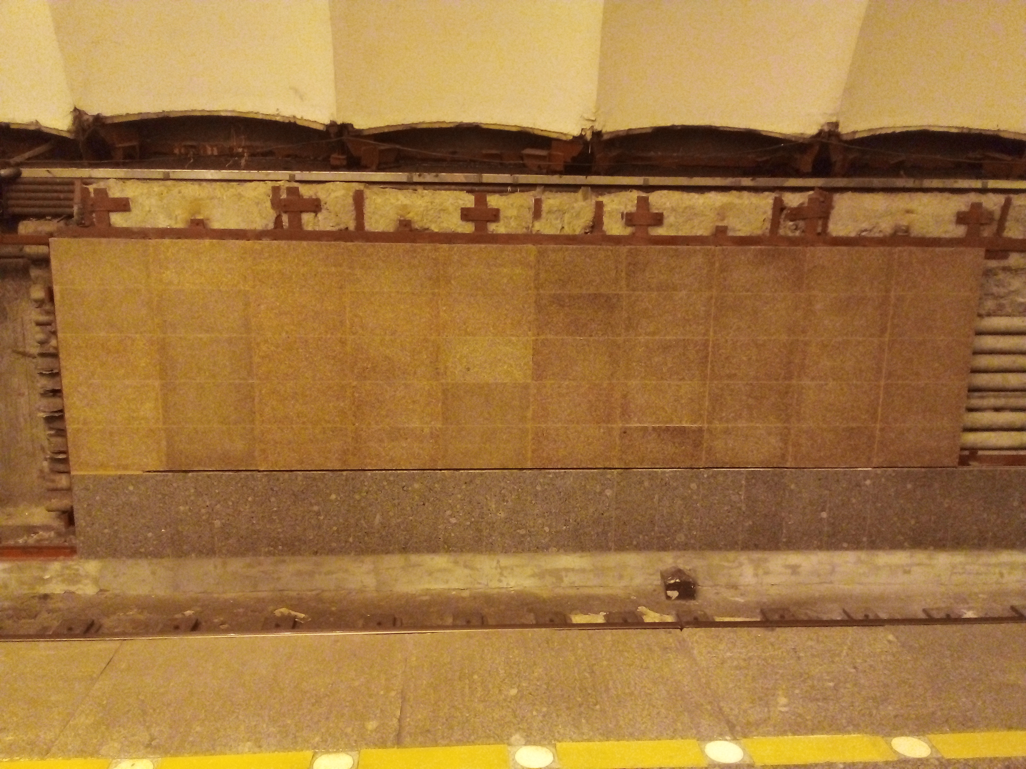 На Новочеркасской по первому пути закончили нижнюю часть облицовки путевых стен и смонтировали первый блок непосредственно самой облицовки. Как по мне, так совершенно не попали в цветовую гамму той облицовки, которая была ранее. Попытался отобразить это в фото, но фотокамера телефона не передает точно всю цветовую гамму, да еще с учетом освещения - тем не менее, что-то всё-таки получилось.
