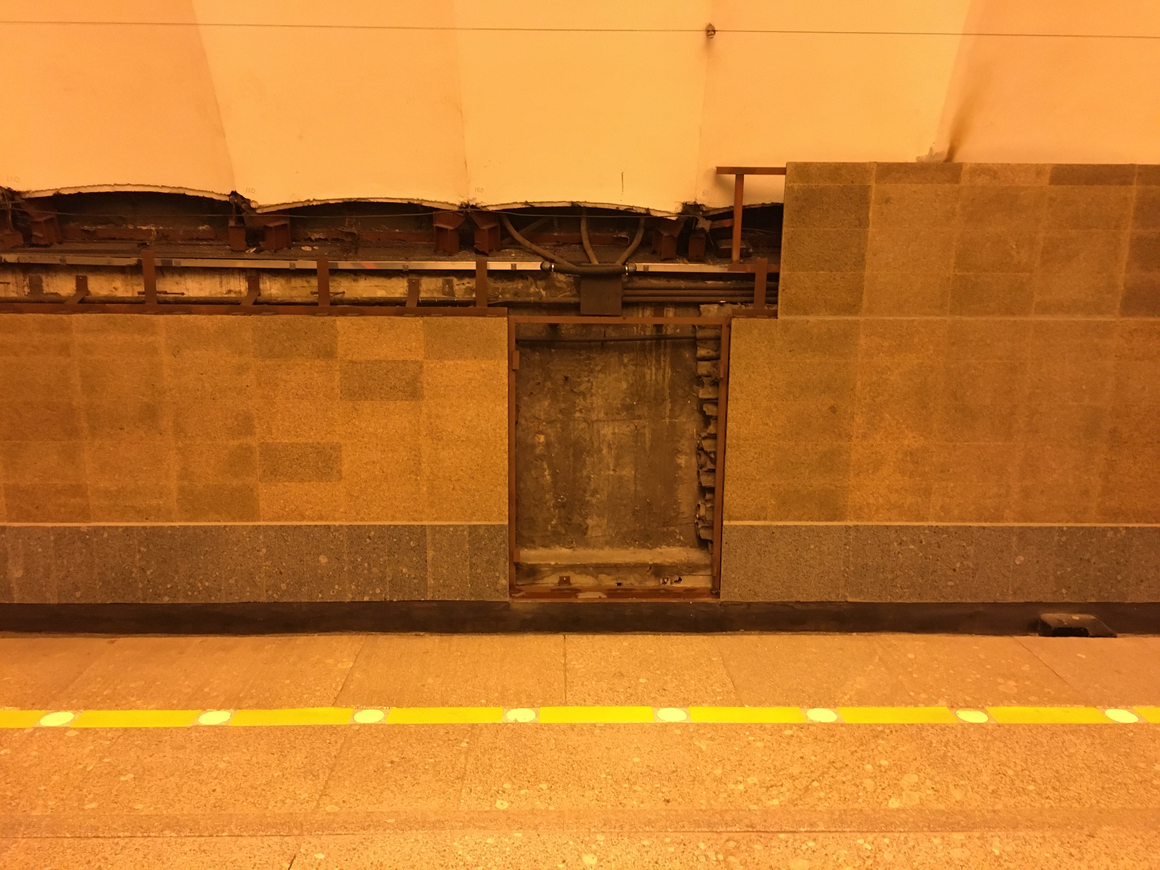 Еще обратил внимание на трубы, которыми соединили лоток, размещенный под водоотводящим зонтом станции над путевыми стенами, в районе кабельных дверей путевых стен (так как там распределительные коробки освещения - это только по 1 пути). Получается, что визуально эти трубы являются самой нижней точкой лотка (могу ошибаться, но на глаз выглядит именно так), и если в лоток будет поступать вода, то именно в районе этих труб она, по идее, и будет скапливаться (но там идеально сухо, воды не наблюдается совсем). Заканчивается этот лоток сливной трубой (я ее снял на фото).