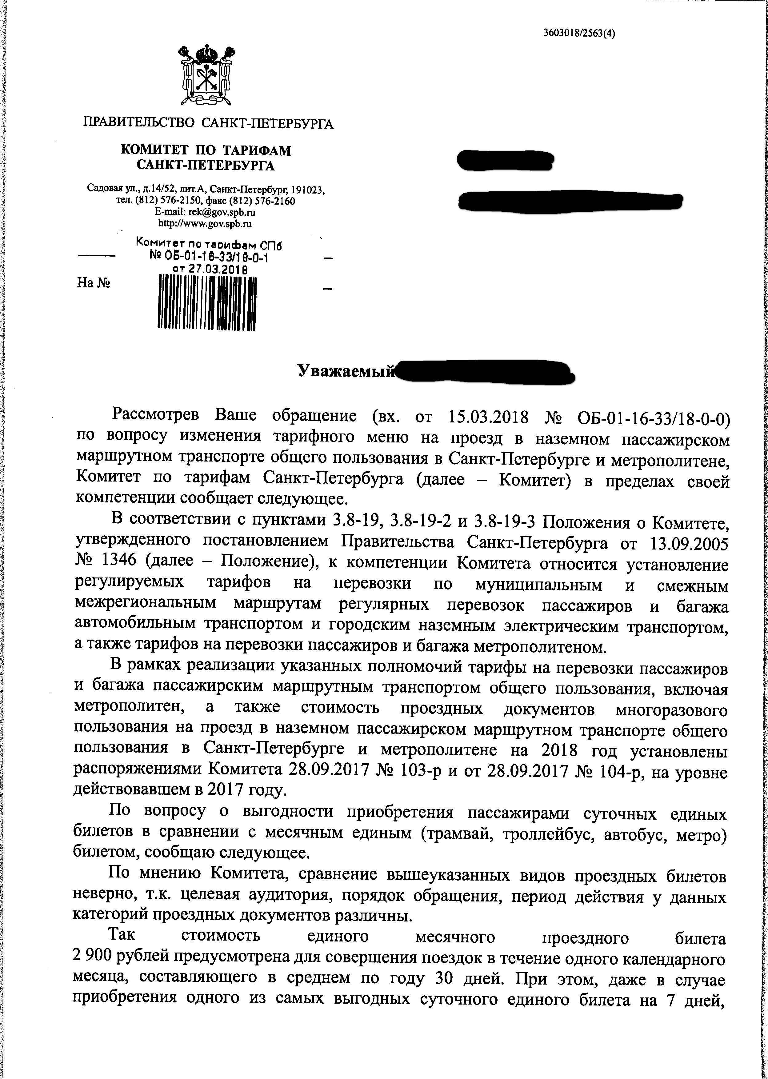 Получил ответ из Комитета по тарифам по поводу единого билета
