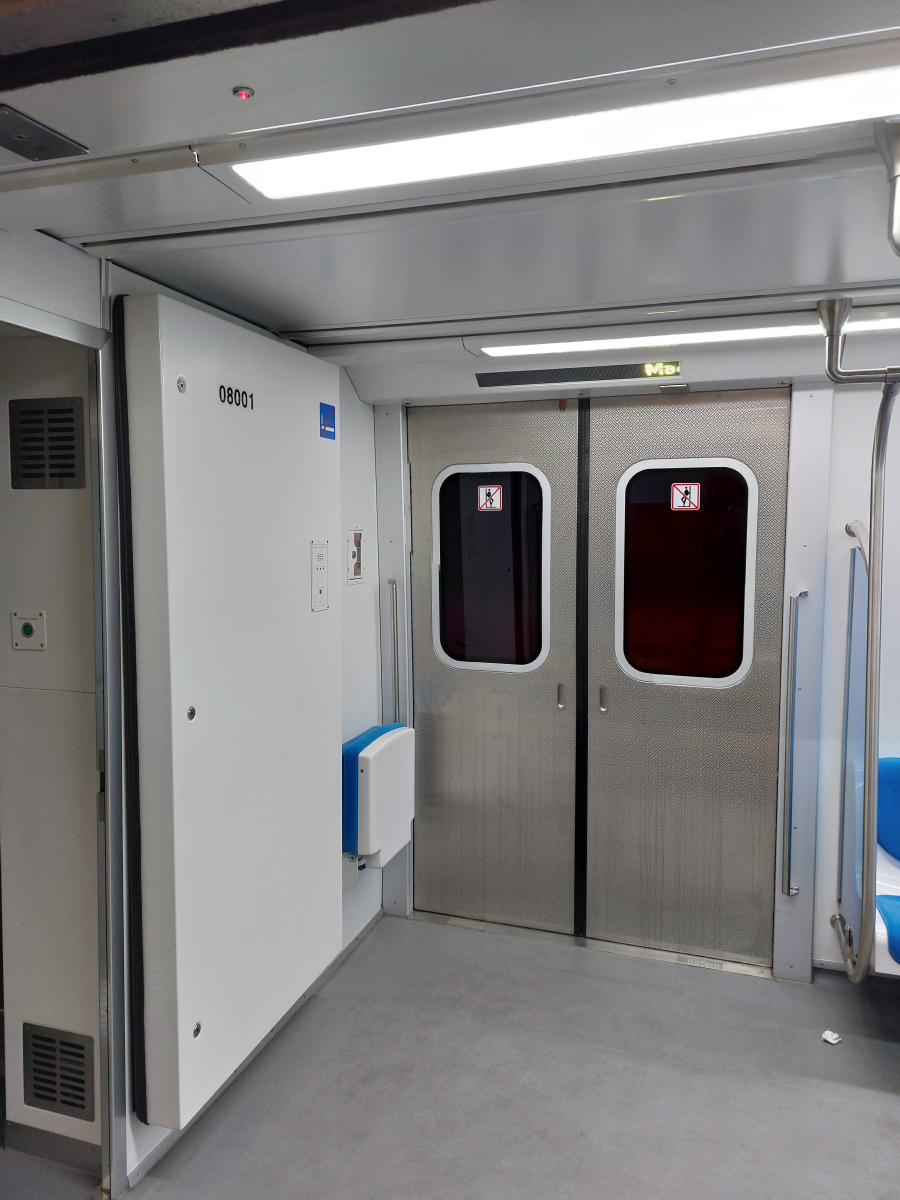 UPD.: В принципе, это вагоны производства испанской CAF, скорее всего, в испанских метрополитенах такое же решение есть или могло быть (по крайней мере, там тоже посадка инвалидов в самую первую дверь). Может быть, в более старых и уже списанных вагонах, в тех где у меня есть инвалидные места на фото, они уже на месте одного из блоков сидений и с пристяжными ремнями.
