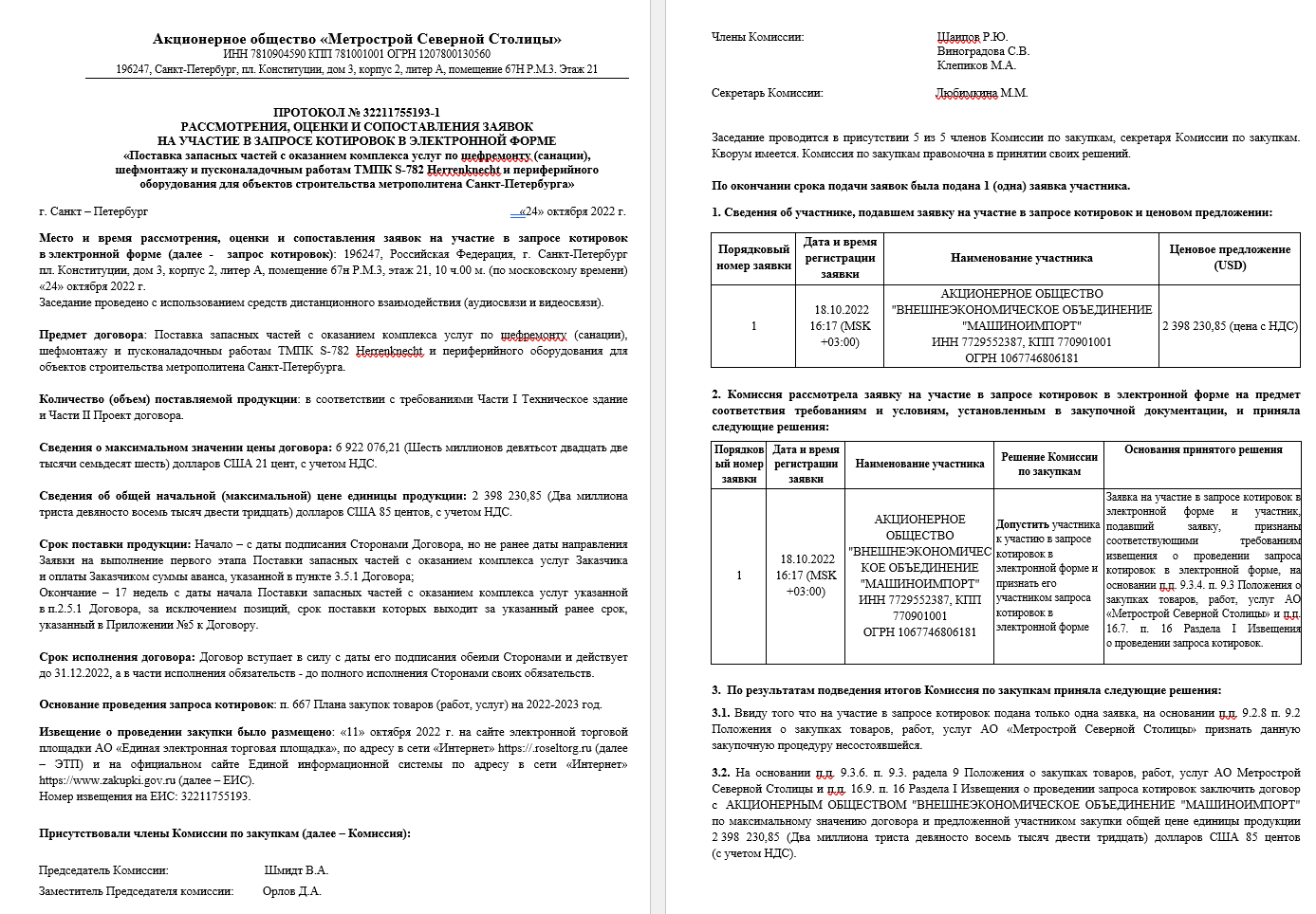Закупка на поставку запасных частей с оказанием комплекса услуг по шефремонту (санации), шефмонтажу и пусконаладочным работам ТМПК S-782 Herrenknecht состоялась