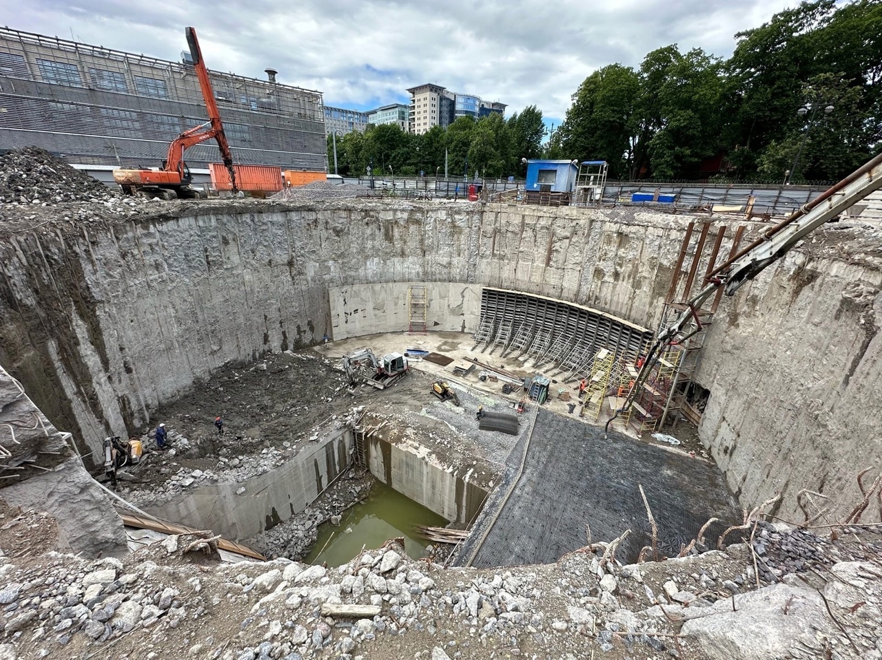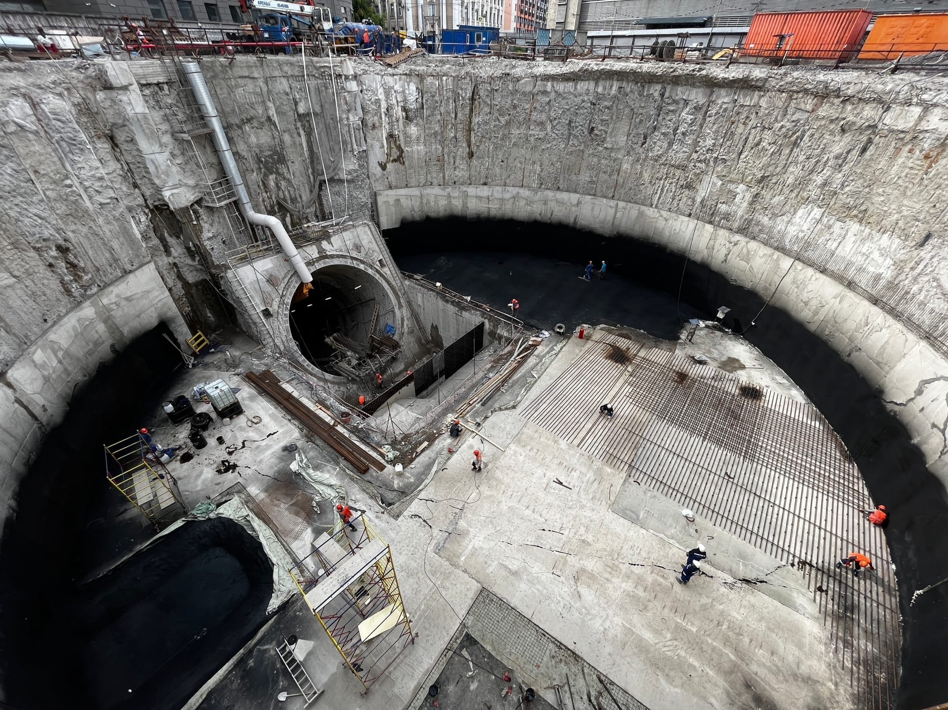 Завершились работы по откопке котлована, сейчас занимаются укреплением основания и ограждающей периметр стены в грунте будущего вестибюля