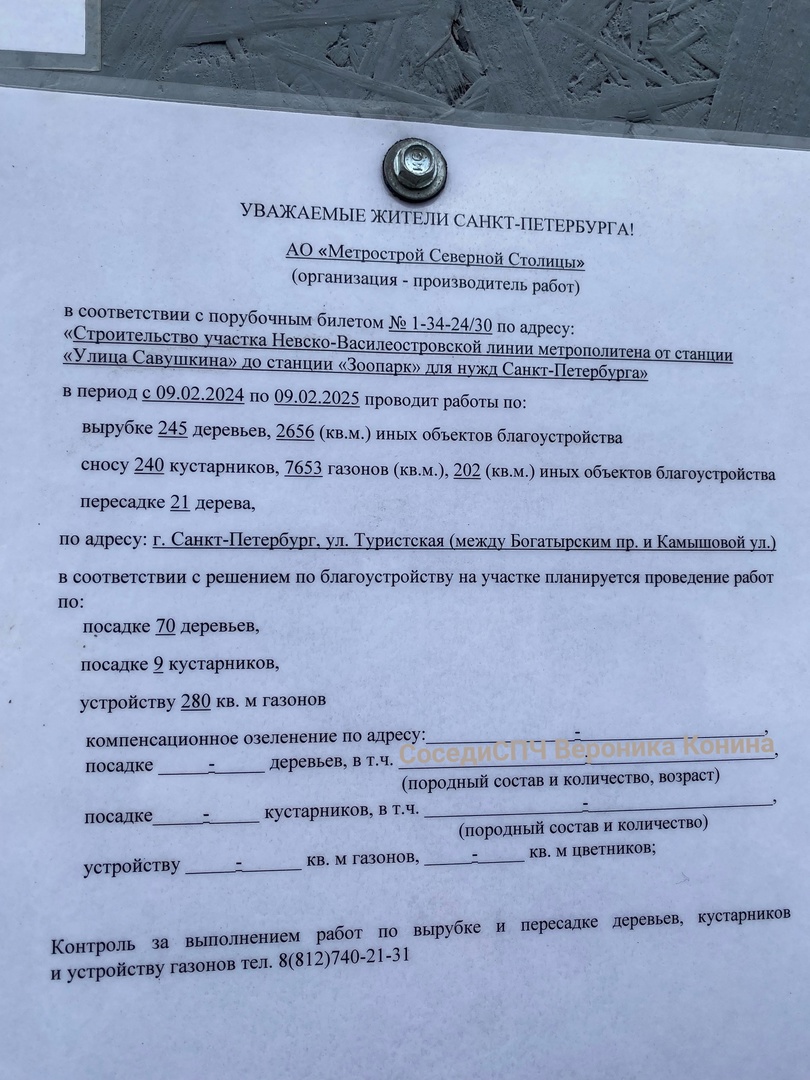 Выдан порубочный на 245 деревьев и 240 кустарников на Туристской между Богатырским и Камышовой.
