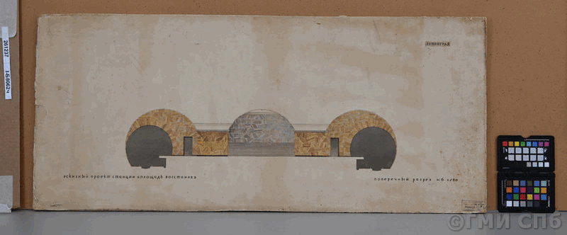 Как насчёт односводчатой станции? А если я скажу, что этот поперечный разрез датируется 1946-1947 годом? Неизвестно, правда, глубокая это станция или мелкая. Подписана как «Поперечный разрез трёхплатформенной односводчатой станции Ленинградского метрополитена», а в нижнем правом углу виднеется «Метропроект»