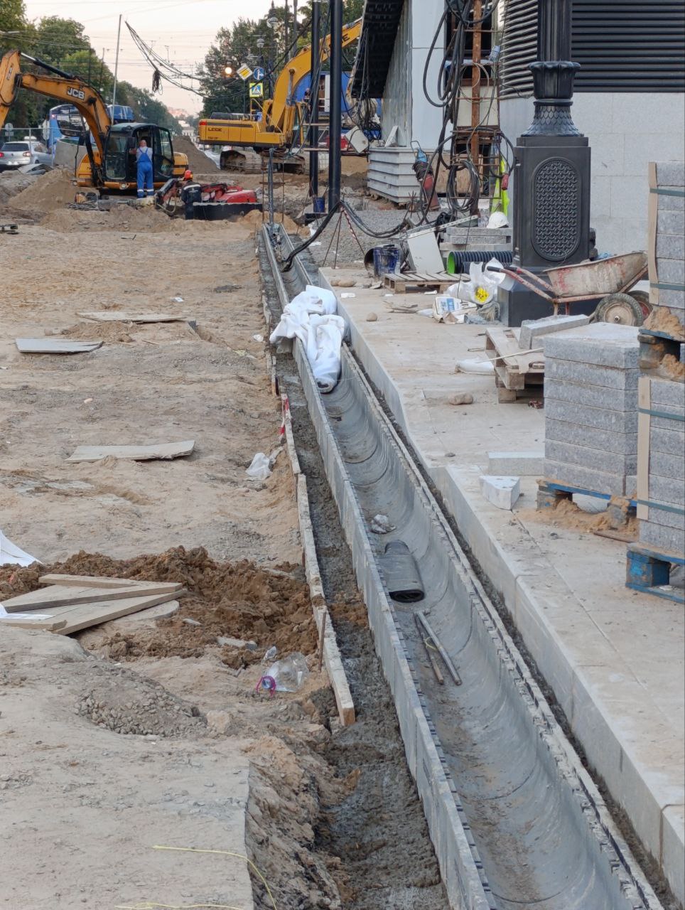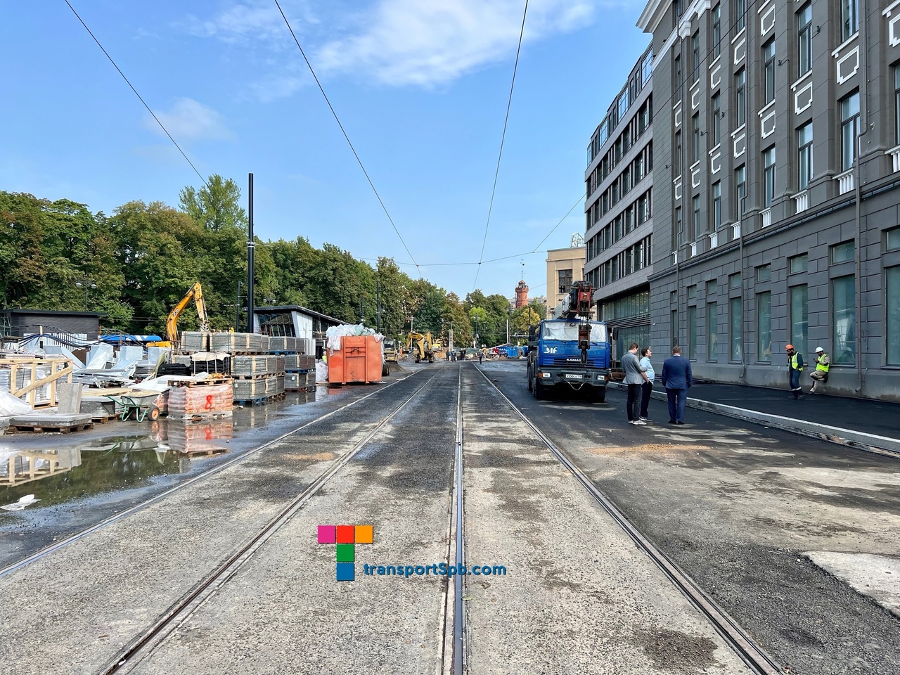 Завершено восстановление трамвайных путей и контактной сети вдоль по Косой линии, остается уложить верхний слой асфальта на проезжую часть. Идут работы по монтажу ограждения проезжей части.