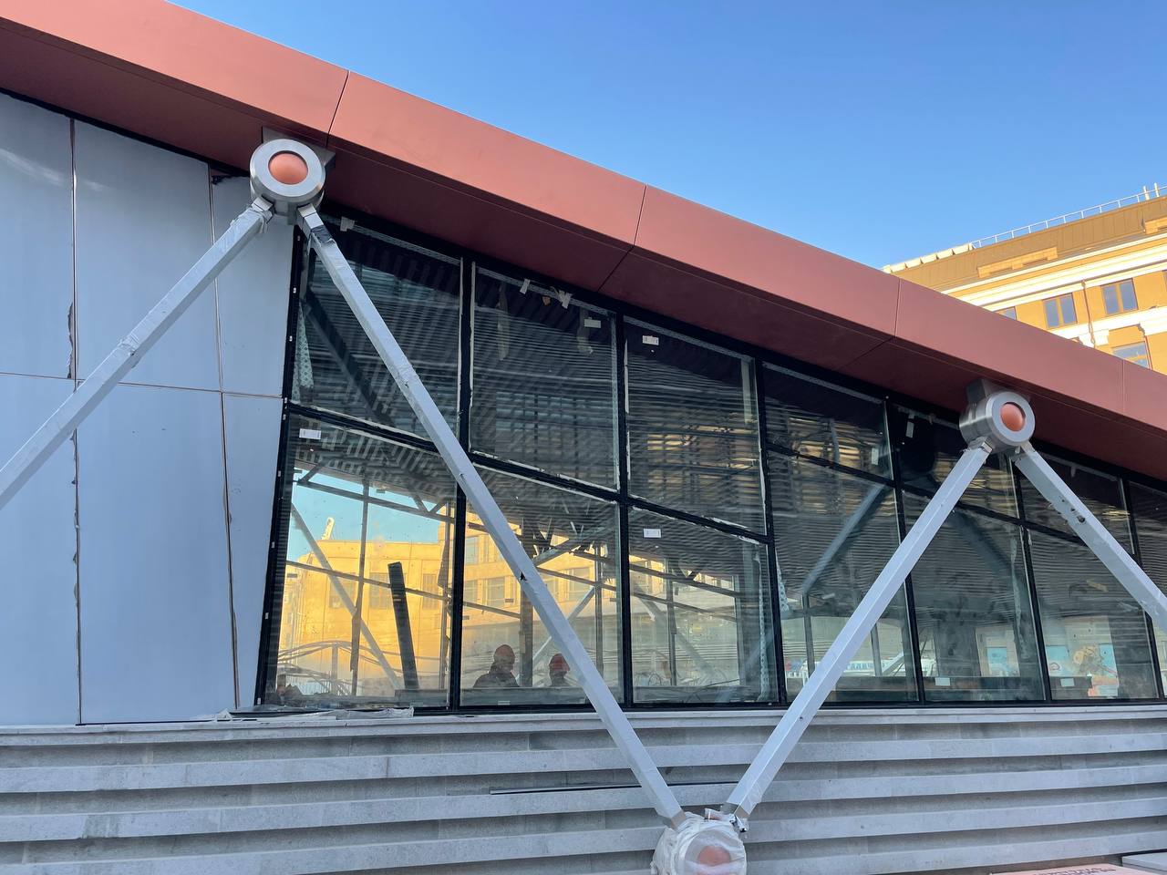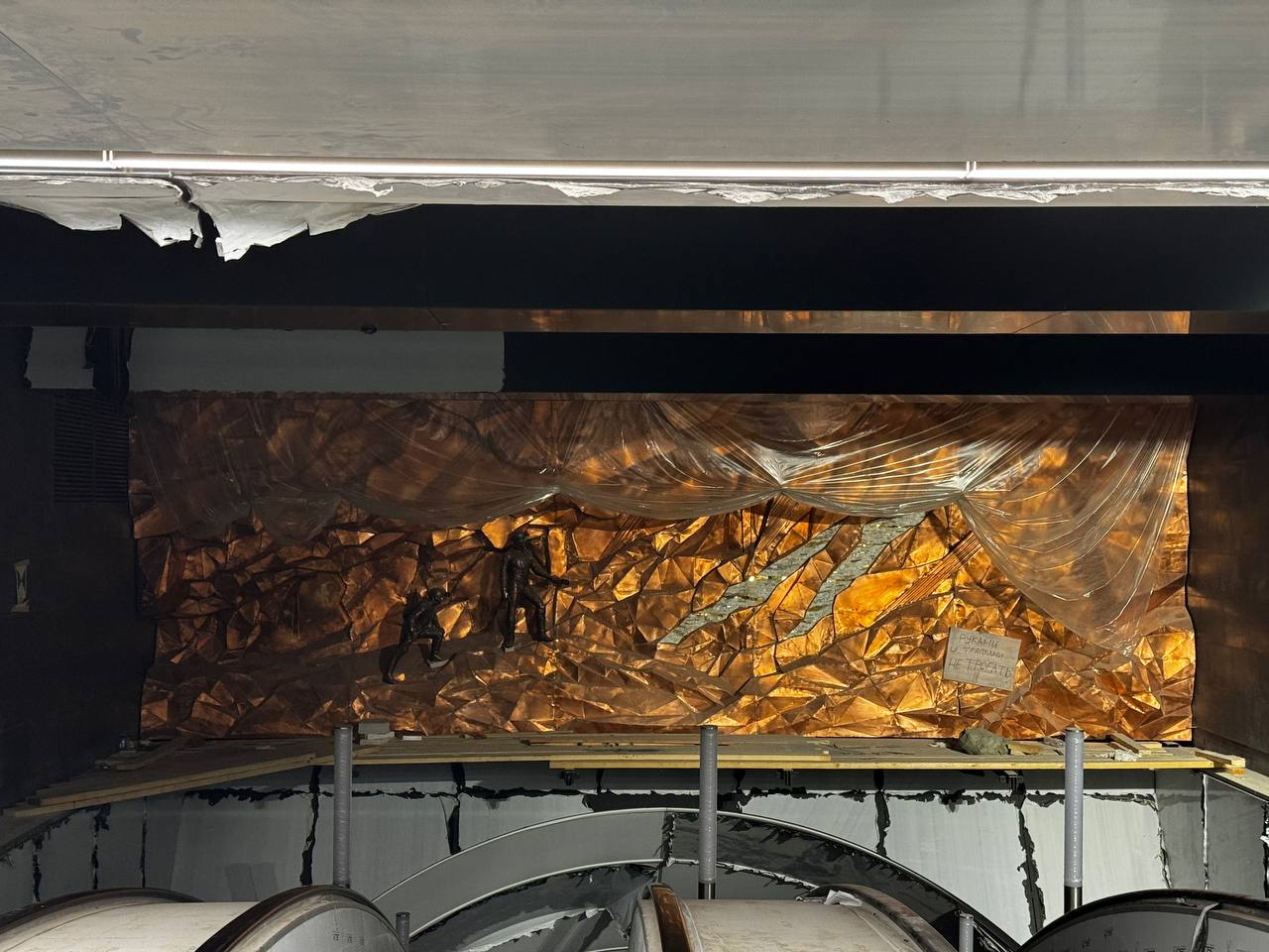 Завершается монтаж лифта для маломобильных групп населения, ведущего на глубину 11 метров в эскалаторный зал.