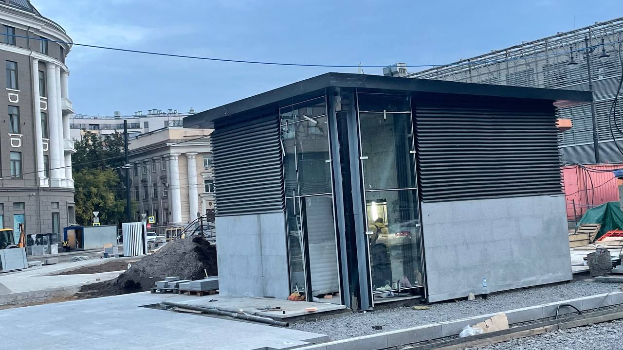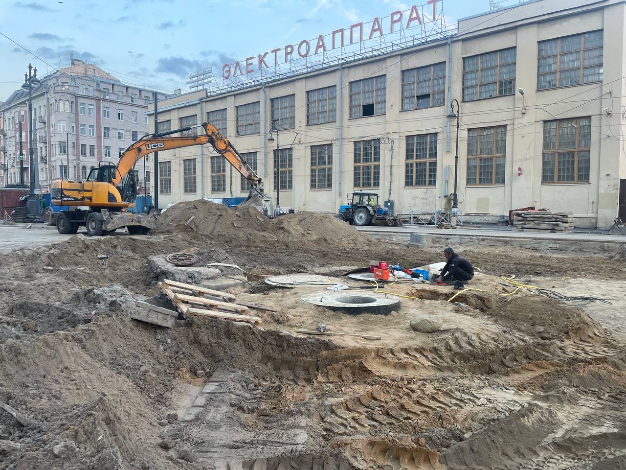 Продолжается благоустройство территории у наземных павильонов вестибюля станции «Горный институт» продолжения Лахтинско-Правобережной (четвертой, оранжевой) линии Петербургского метрополитена.