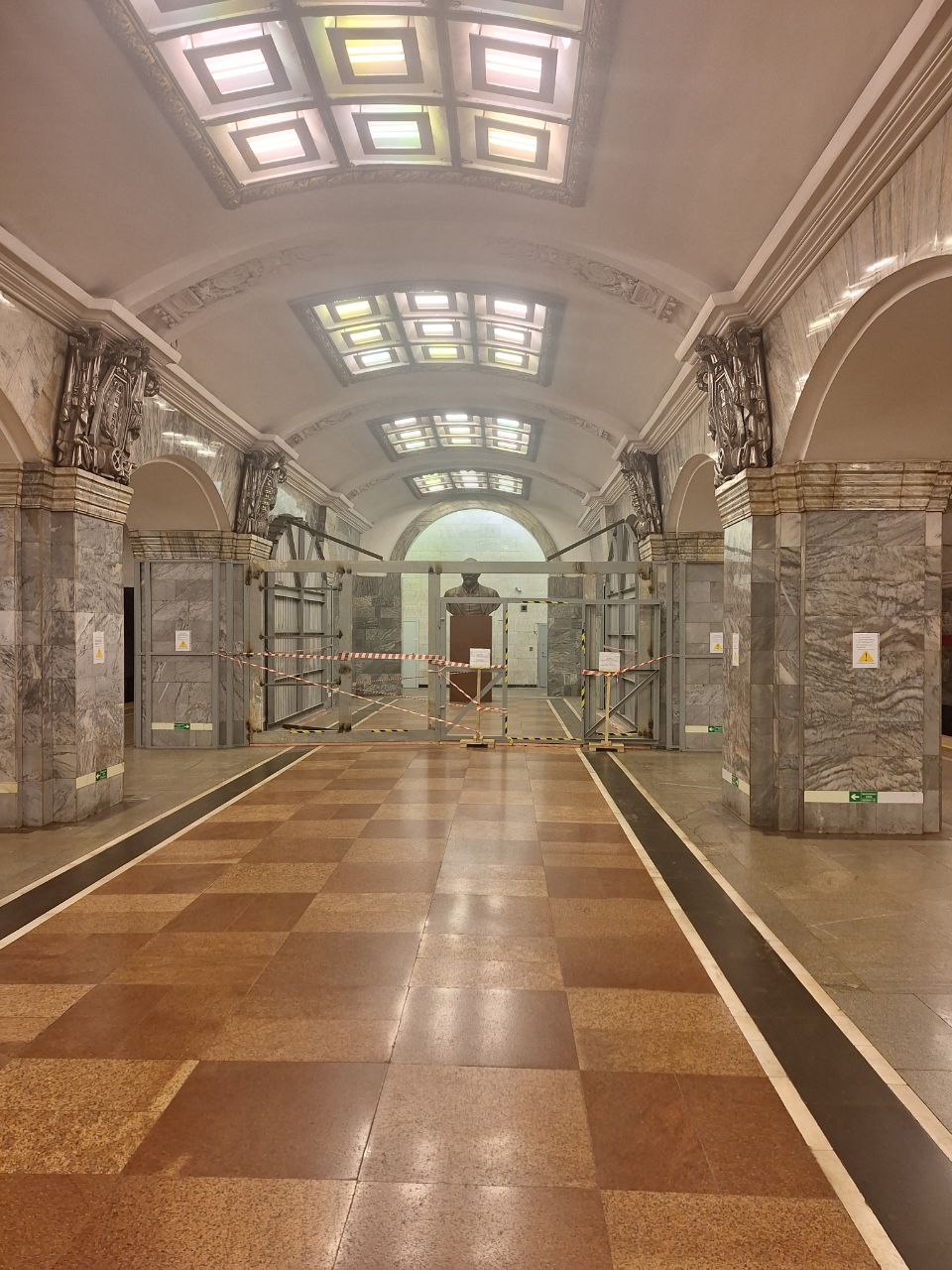мда, сделать первую ступеньку вровень с колонной последнего проема было не судьба... но особенный, простите, кринж - это Ленин, передвинутый вперед, посреди прохода. и я вовсе не о политическом аспекте - как я уже высказывался раньше, предлагаю относиться к данному деятелю как к Тутанхамону, Чингисхану или Наполеону - т.е. как к истории. но неужели нельзя было найти более удобное для пассажиров месторасположение бюста? или это требование КГИОПа, чтобы он оставался в перспективе станции на уровне платформы? в общем, люди будут спускаться с лестницы почти буквально в затылок Ильича. да, конечно, станции уже застолбили инфоСОСами и т.п., но они хотя бы в самом центре платформы обычно стоят - а тут "столб" прямо на проходе. я такой логистической глупости в ПМ еще не припомню...