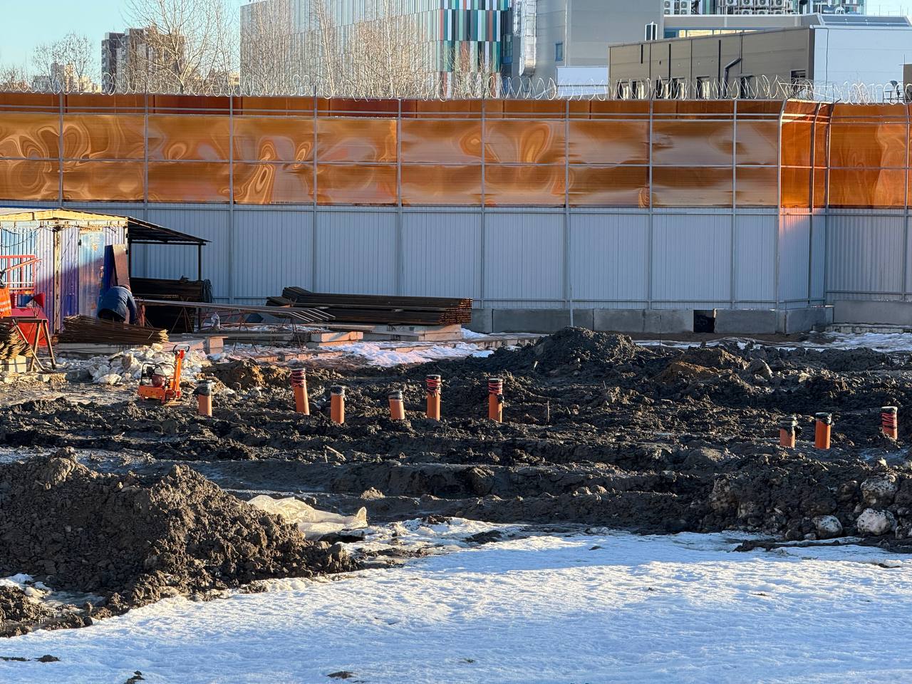 На месте первого участка строительной площадки продолжаются работы по выравниванию участка, укладываются дорожные плиты и устанавливается ограждение.