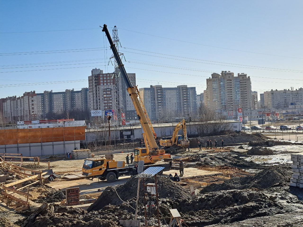 На строительной площадке в Приморском районе Санкт-Петербурга, рядом с пересечением Комендантского и Шуваловского проспектов, ведётся сооружение форшахты для стены в грунте.