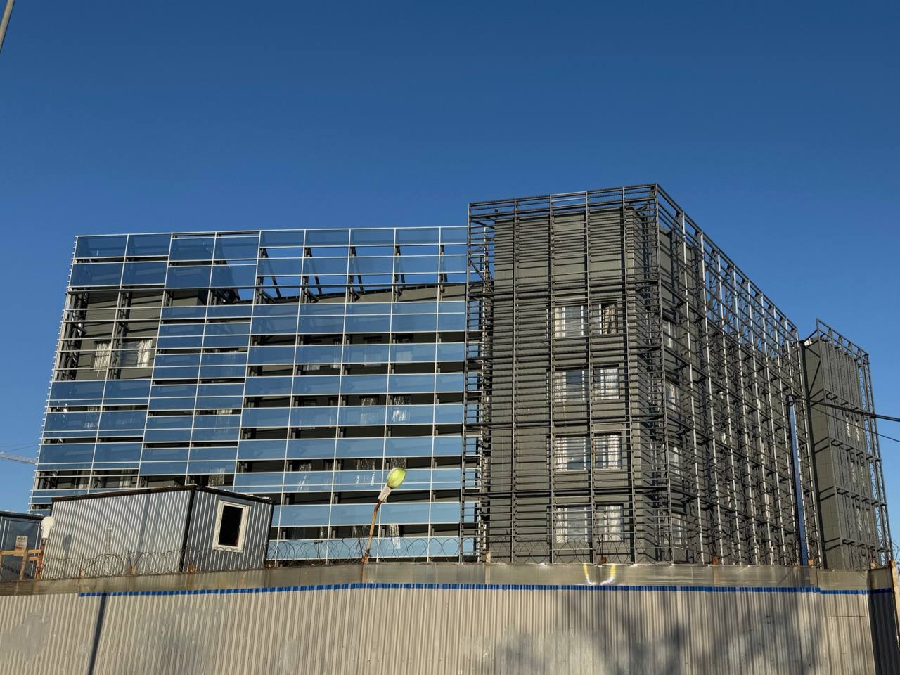 Солнечная погода подчеркнула современный облик здания: стеклянный фальш-фасад эффектно отражает свет, создавая ощущение простора и легкости.
