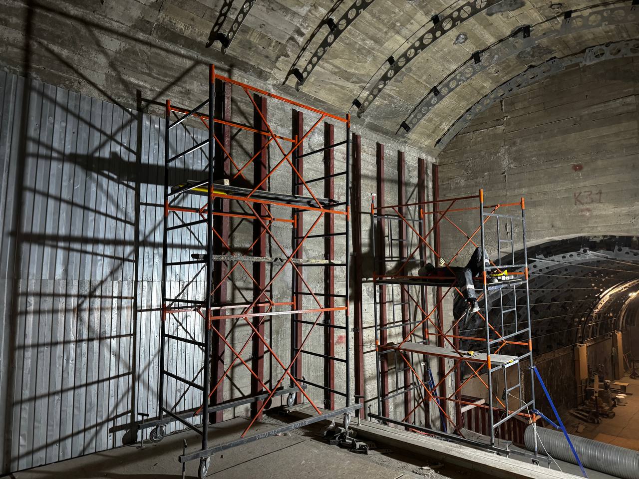 Сейчас здесь продолжается работа по устройству копра шахты. В дальнейшем весь комплекс, который здесь сооружается будем важной частью перехода между станциями «Кировский Завод» и «Путиловская».