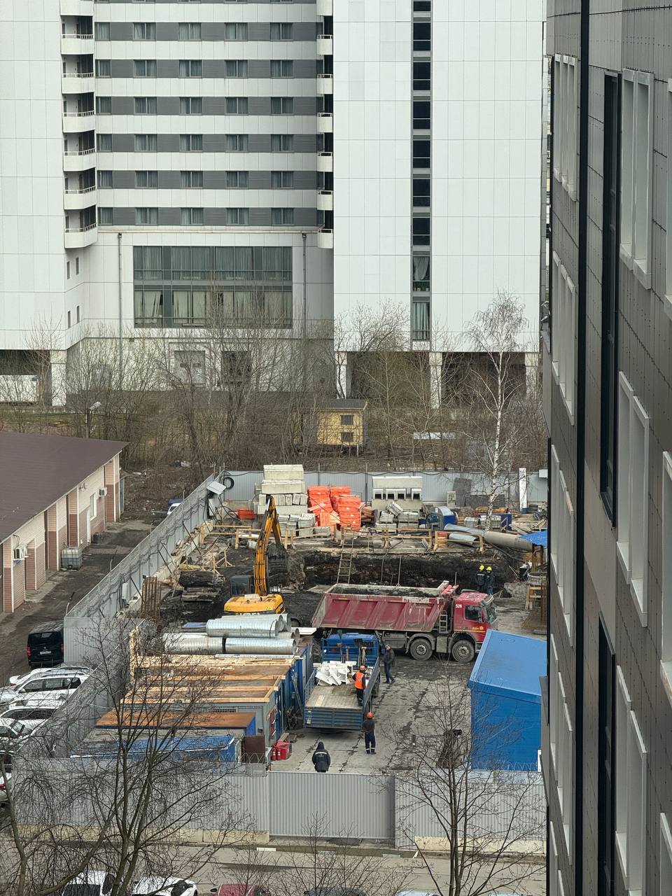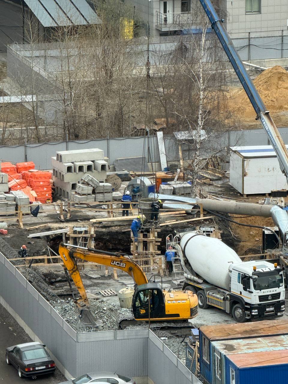 Строители продолжают устройство фундамента будущего здания комплекса. Неглубокий котлован на фотографиях - это он. Восточная часть фундамента уже готова, а остальную уже забетонировали.