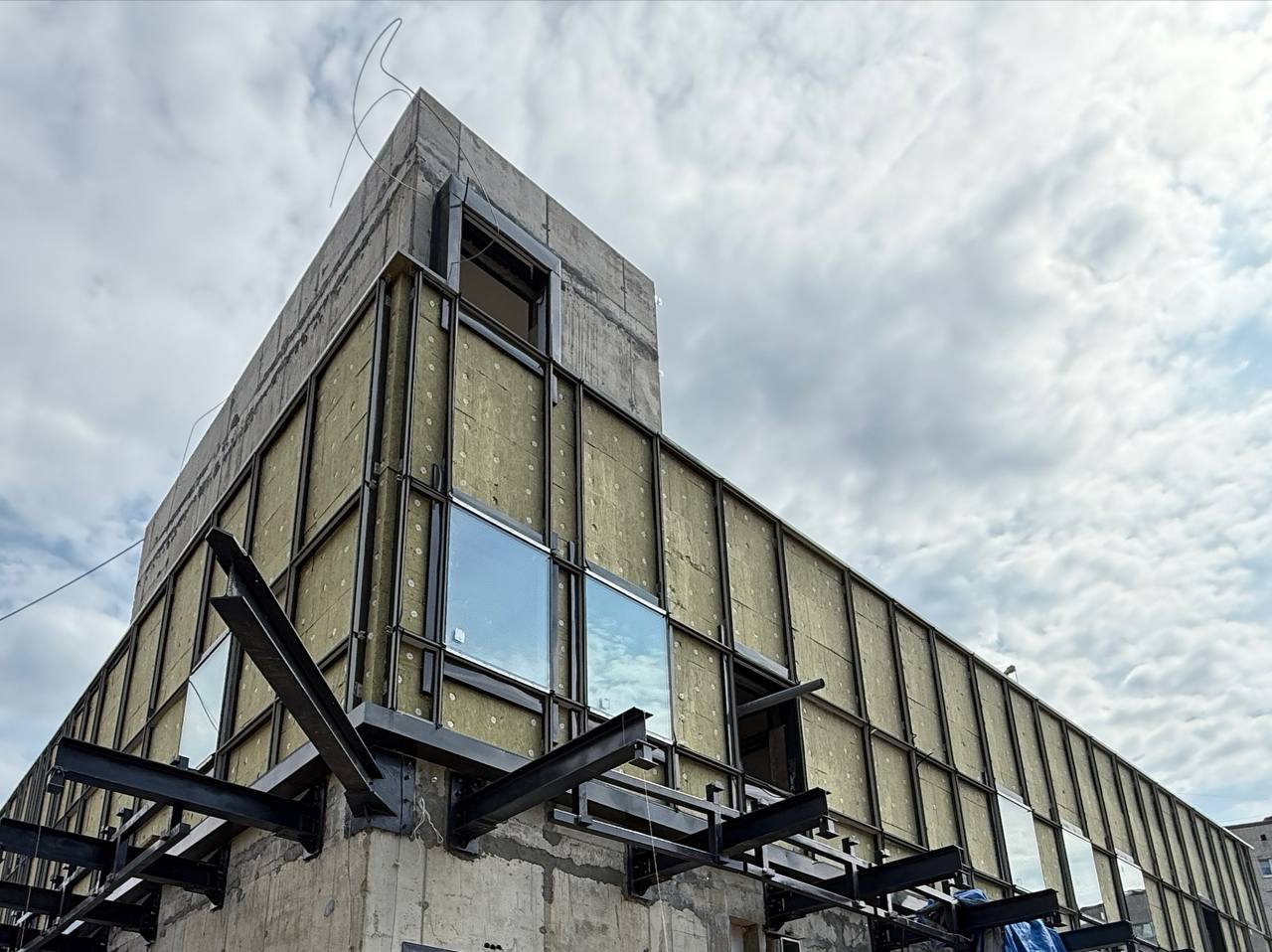 Продолжается монтаж подсистемы для стеклянной части фасада. Установлены первые стеклянные элементы фасада в оконные проёмы.