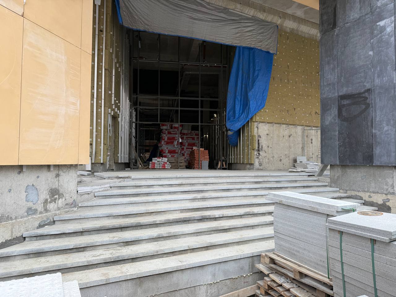 Приступили к облицовке натуральным камнем цоколя пандуса для маломобильных пассажиров.