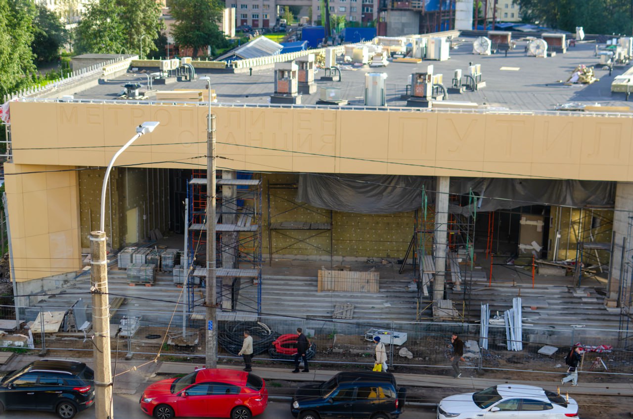 На строительстве вестибюля станции «Путиловская» Красносельско-Калининской линии Петербургского метрополитена со стороны улицы Васи Алексеева устанавливают витражи для помещений встроенных торговых павильонов.