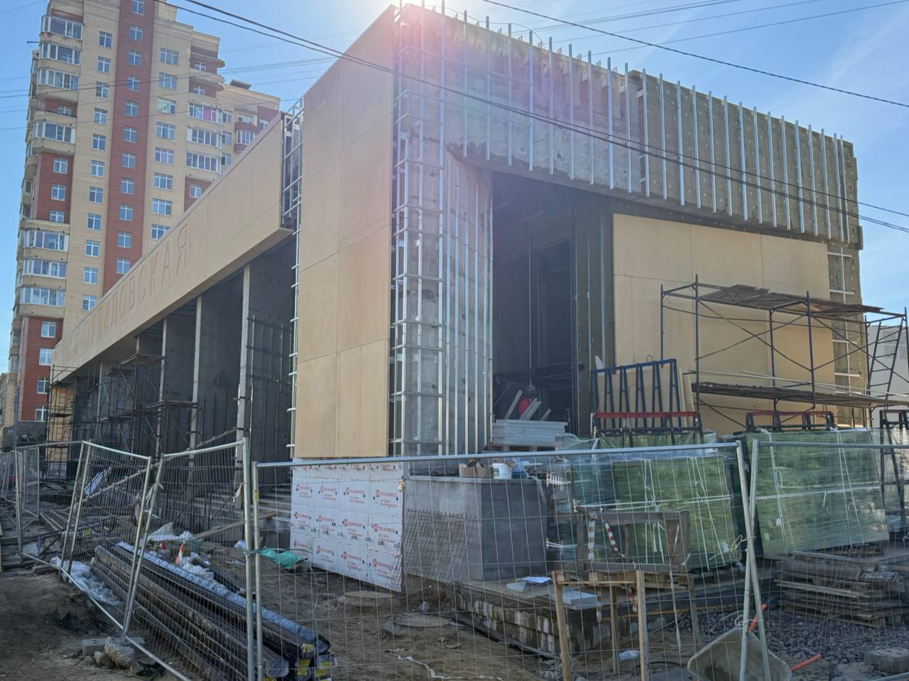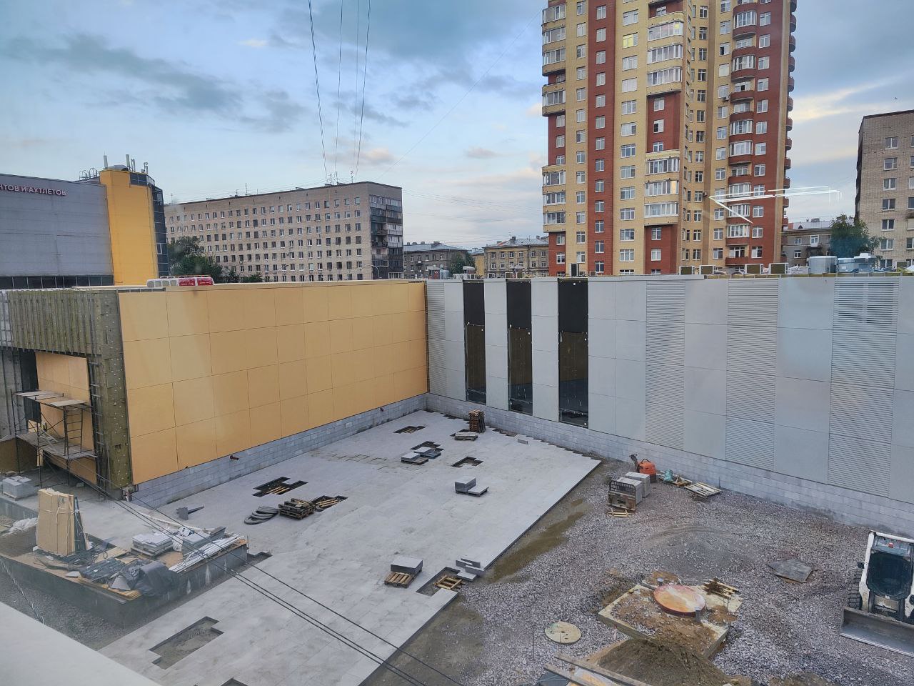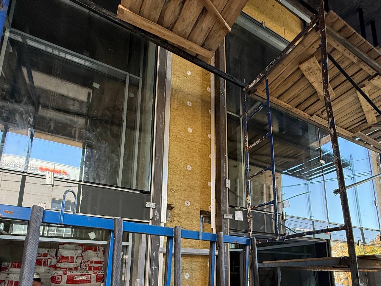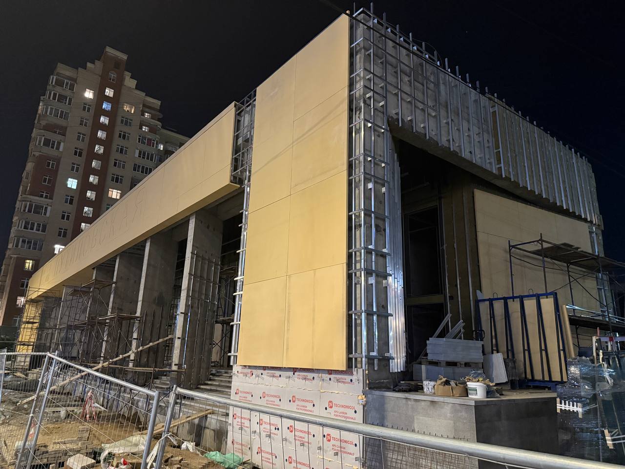 С фасада выходящего на улицу Васи Алексеева проступают к остеклению коммерческих помещений, а также идёт подготовка к установке витража между входом и выходом. На колоннах входной группы появились первые облицовочные плиты из натурального камня, которыми заменили чёрные панели из фибробетона.
