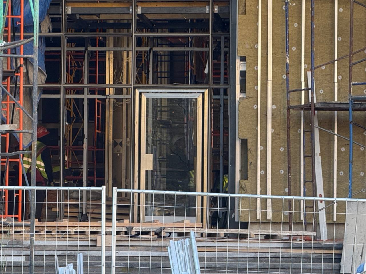 На этой неделе на фасаде вестибюля, выходящем в сторону улицы маршала Говорова, установили ещё три широкоформатных стеклопакета.