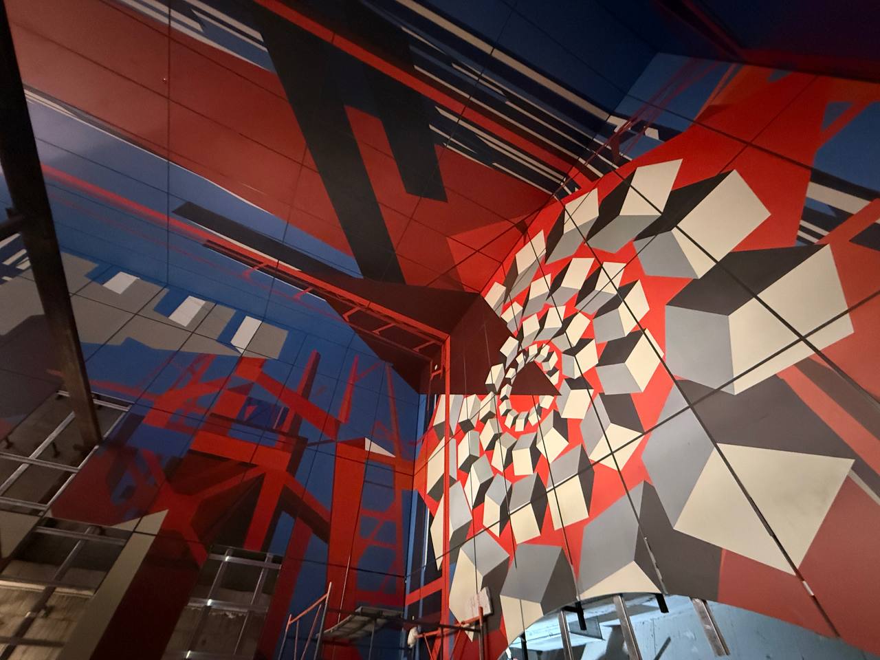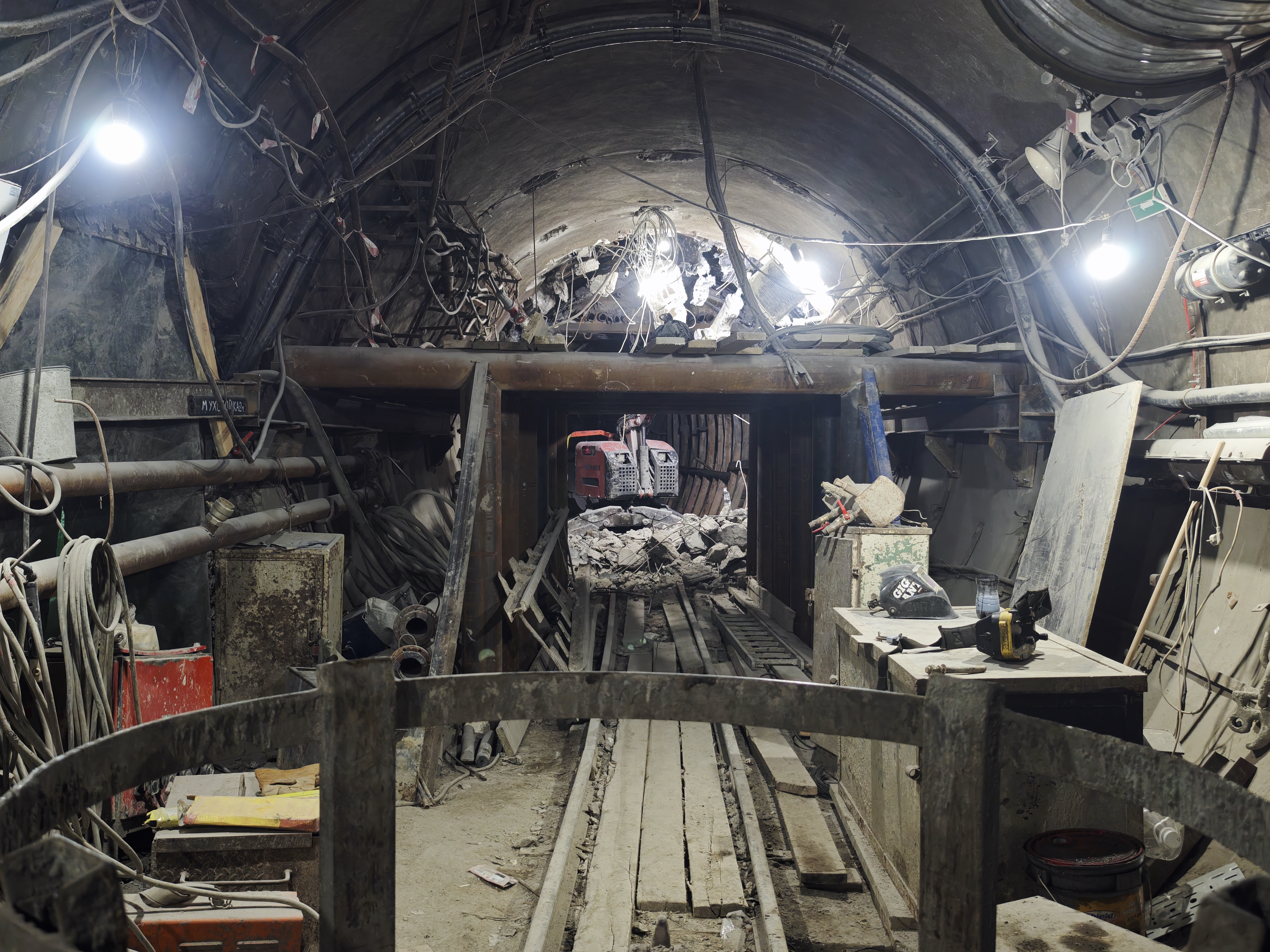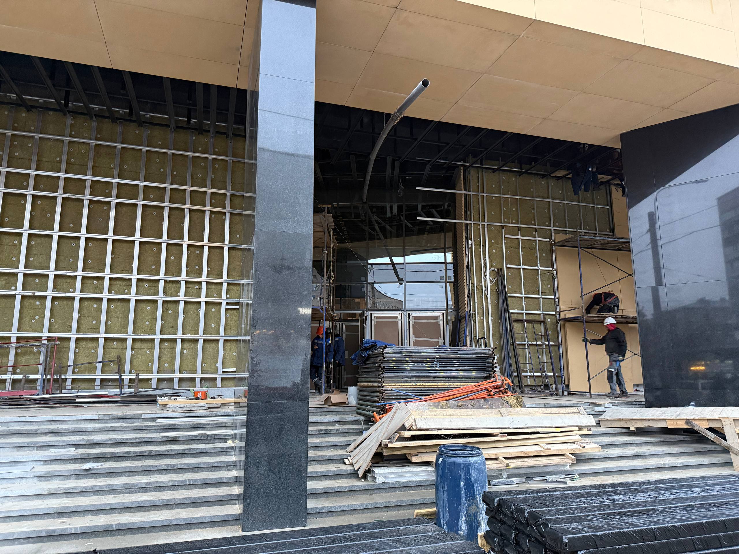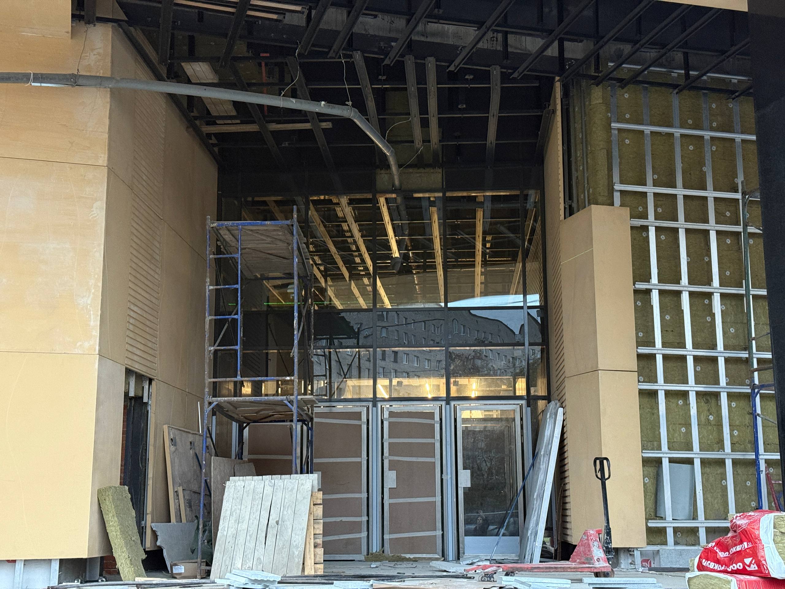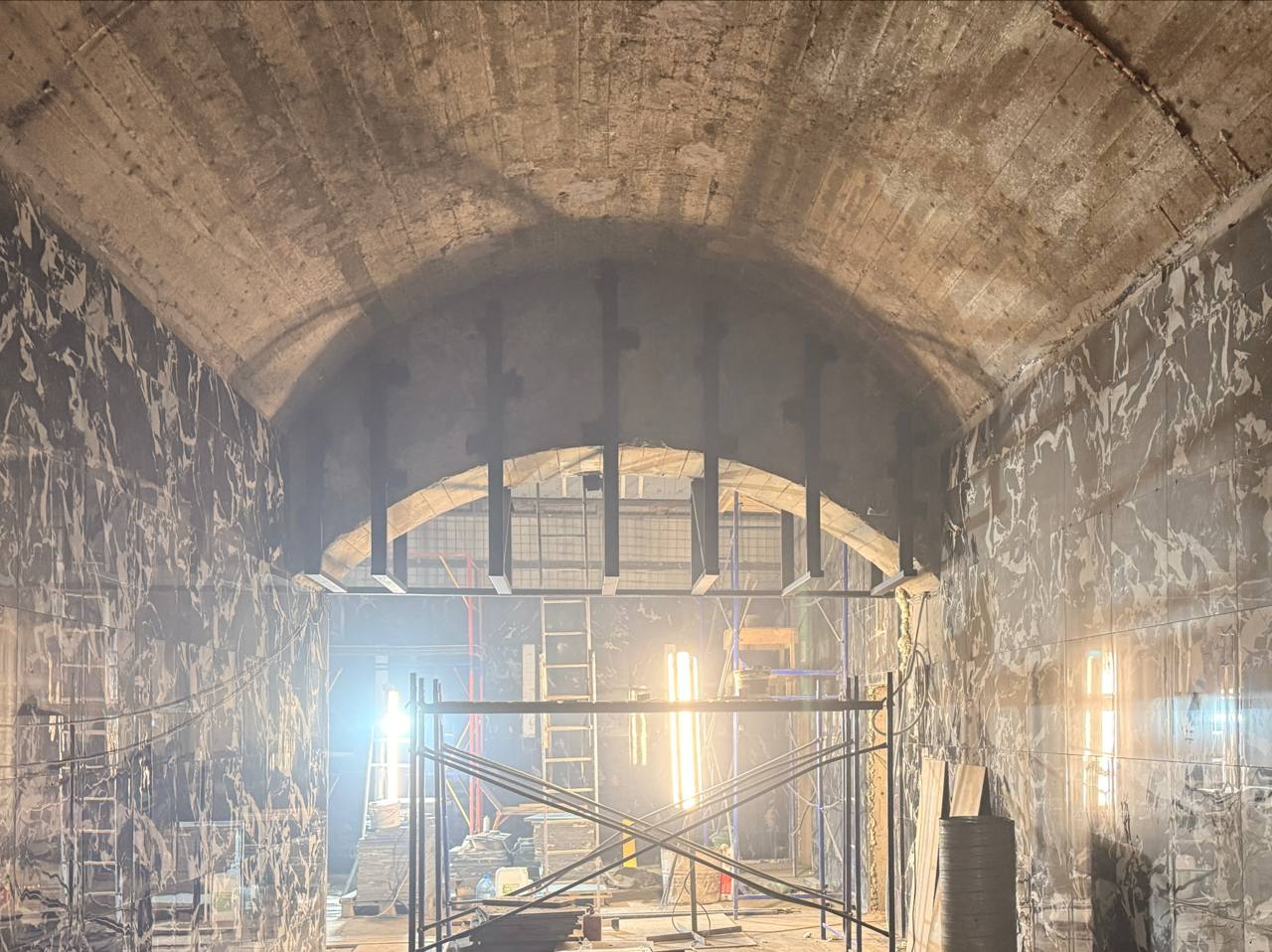 Ранее были выполнены следующие работы: демонтированы арка и часть торцевой стены, а также возведены внутренние конструкции — забетонированы плита перекрытия и лестничный марш для спуска на станцию.