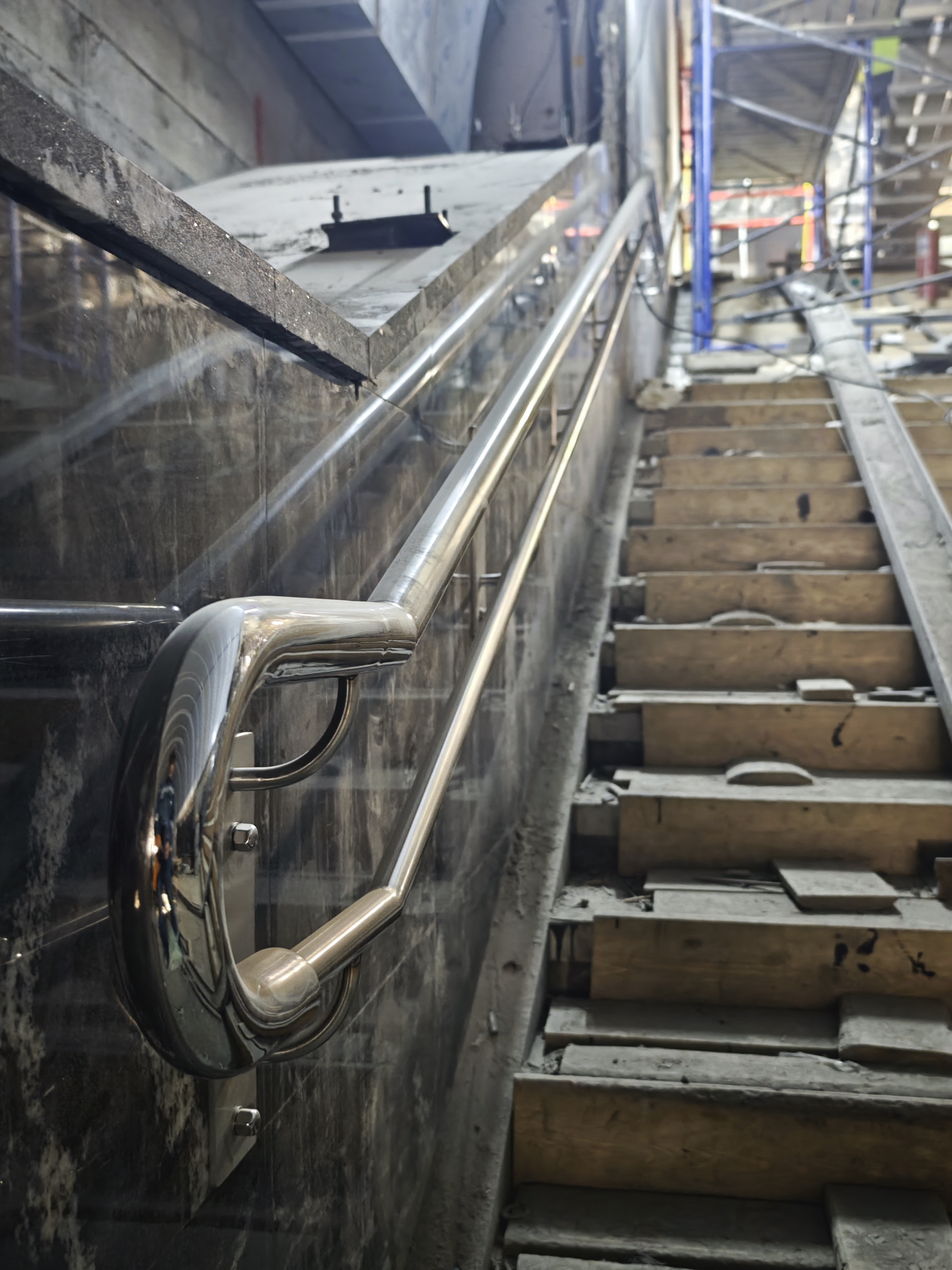 Завершается облицовка лестничного марша плитами из натурального камня. Этот марш ведёт из центрального зала станции «Кировский завод» к подходному коридору, который соединяется с малым наклонным ходом.