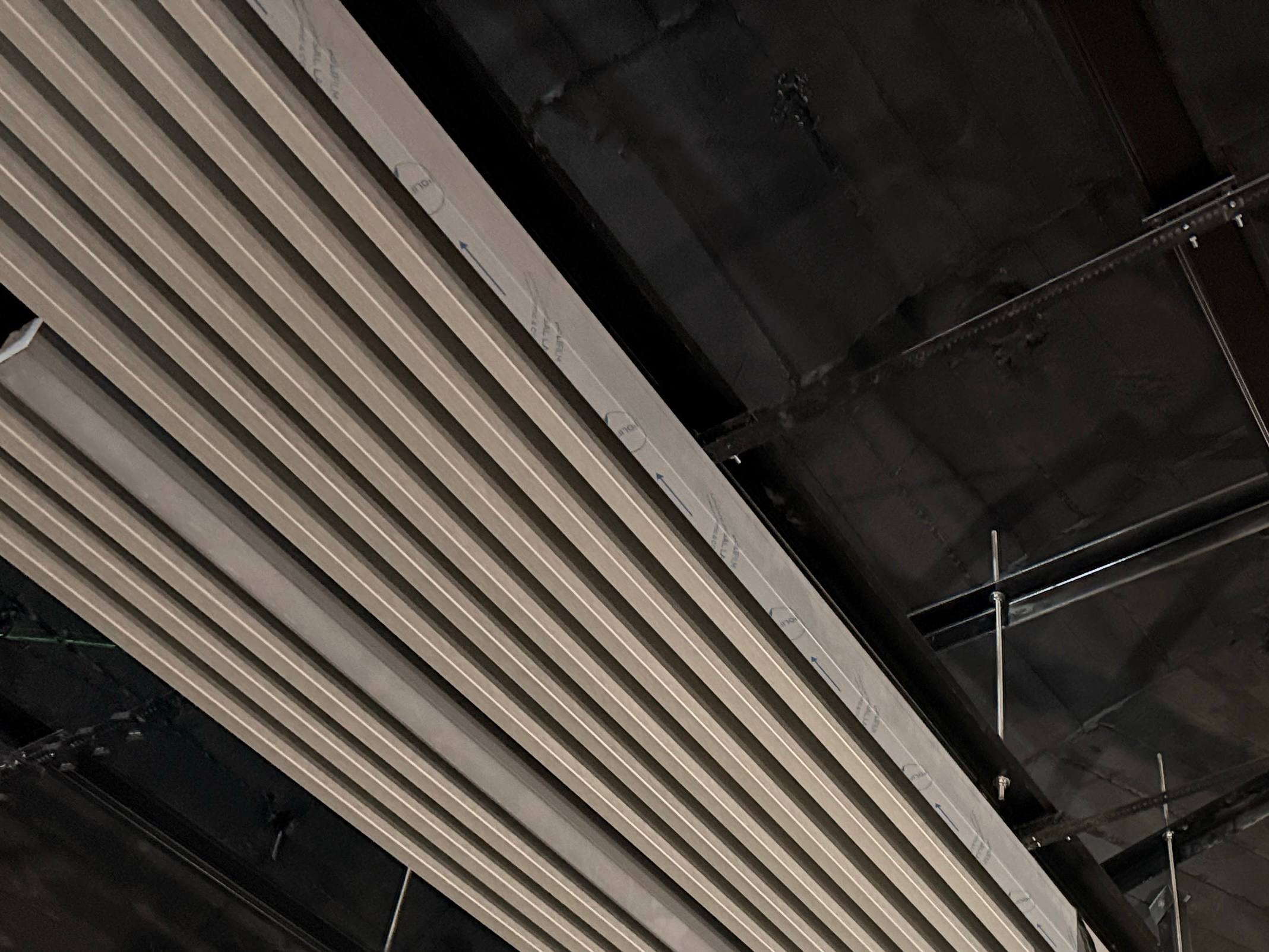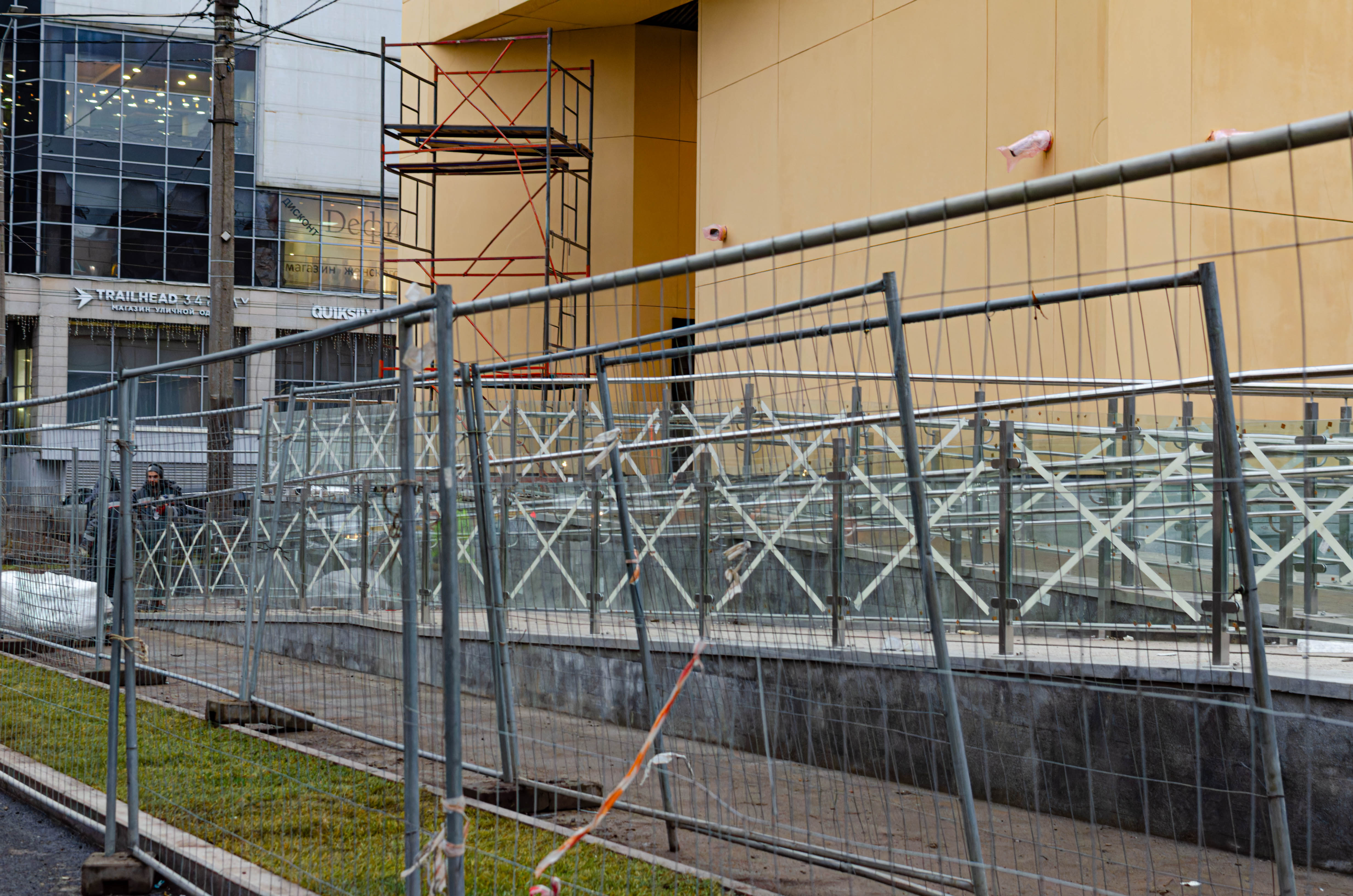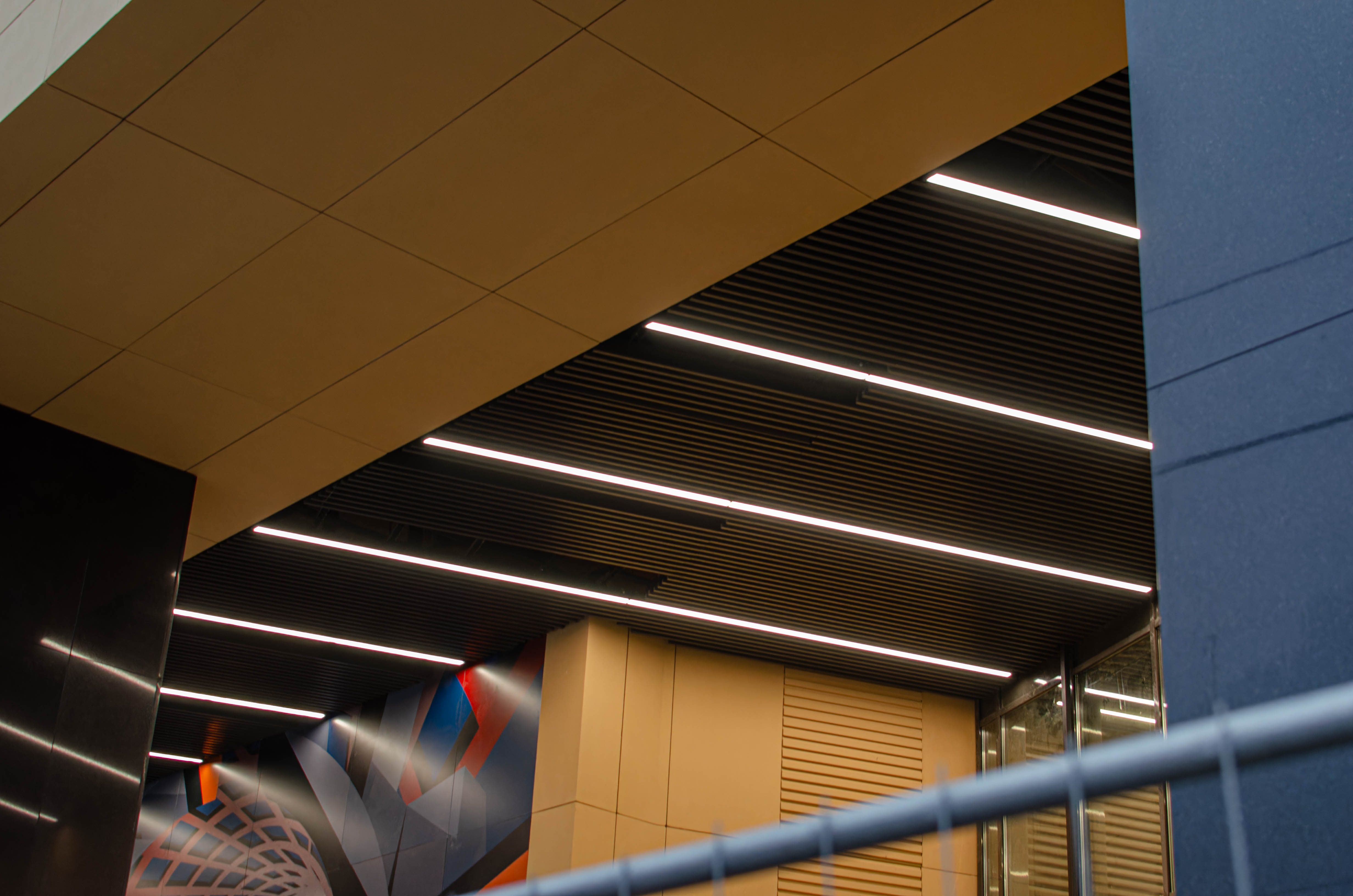 Со стороны улицы Васи Алексеева, у входной группы и коммерческих помещений, расположенных под антаблементом вестибюля, завершаются работы по монтажу подвесного потолка из реек кубической формы (так называемой «куботы») и светильников.