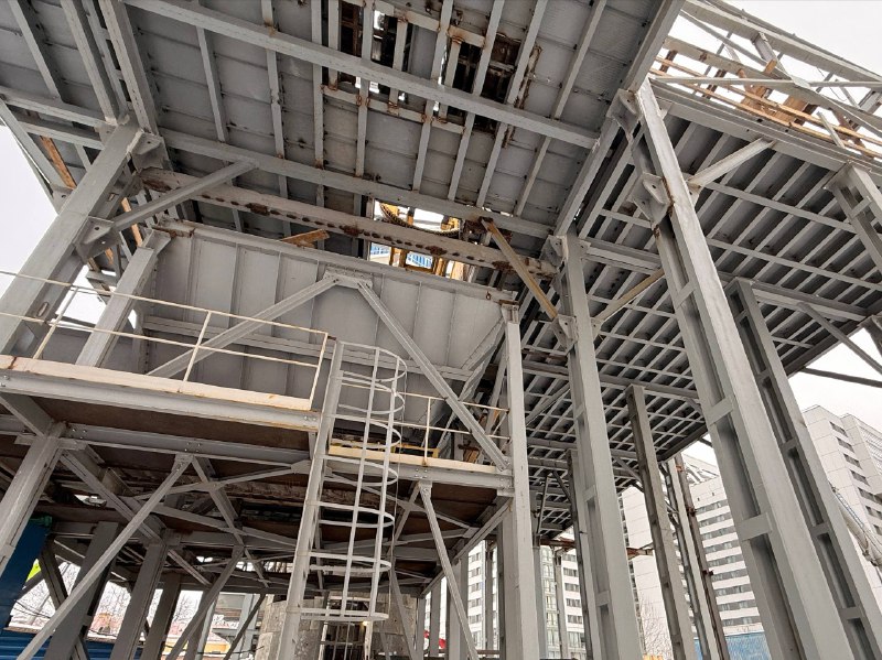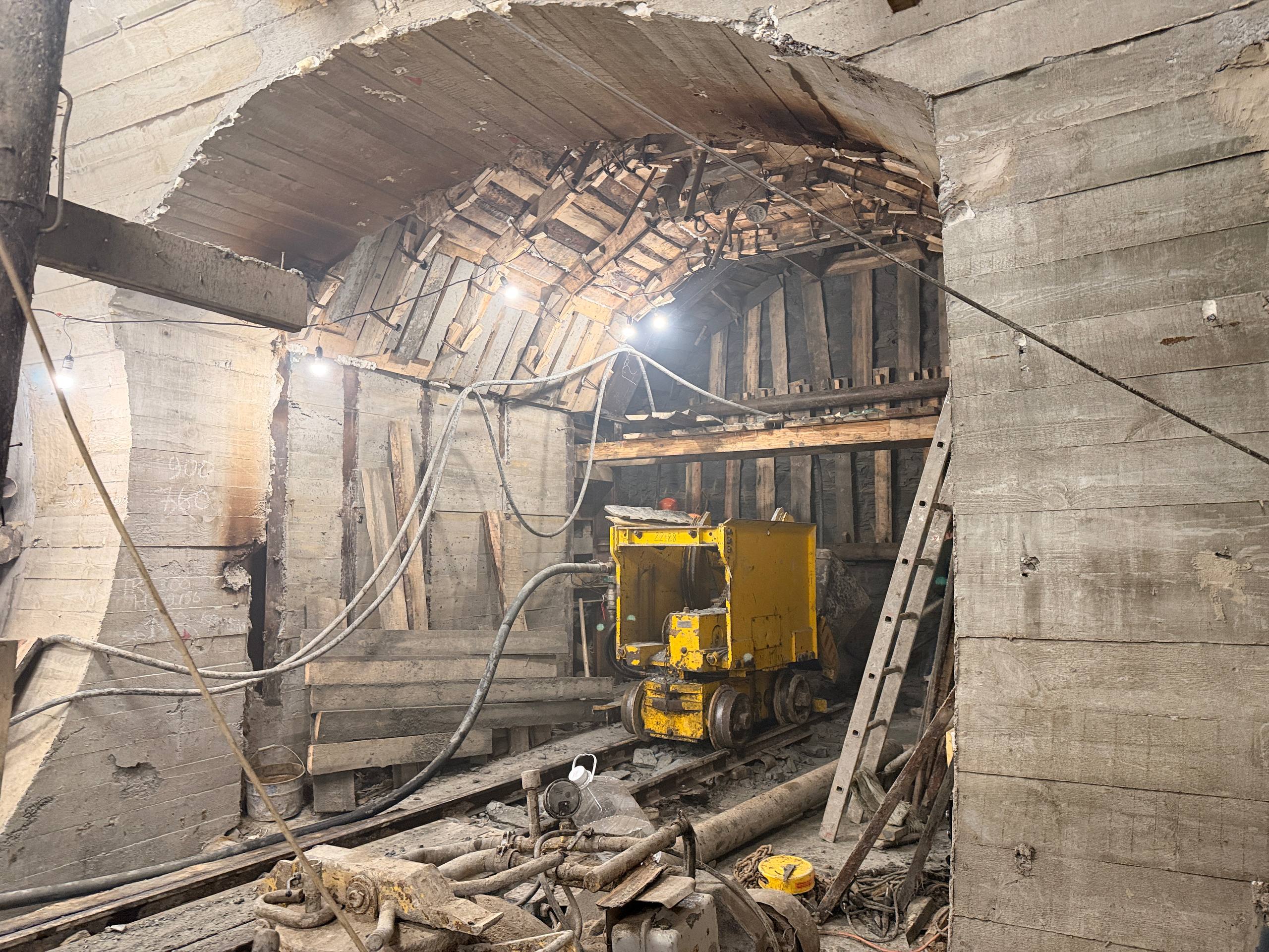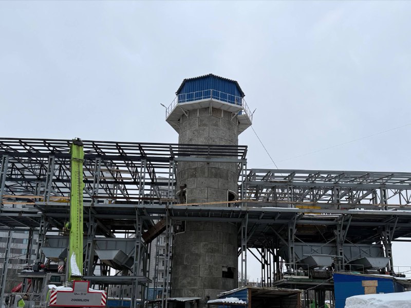 Полным ходом идёт оборудование горного комплекса. Установлены все несущие опоры и горизонтальные балки перекрытий, подвешены 4 бункера-накопителя для грунта. Ведётся наладка подъёмной машины.
