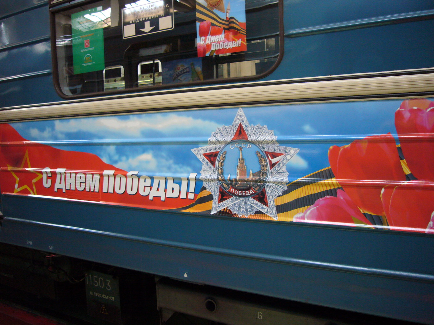 К 9 мая, в метрополитене появилась реклама с поздравлениями. Помимо привычных наклеек в вагоне, оклеены и борта.