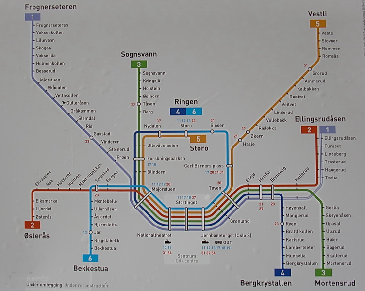 Метро в Осло - это объединение бывших пригородных железнодорожных и трамвайных линий, переделанных в метро. Всего в ослинском метро примерно 6 линий. Несмотря на то, что метро там не очень интересное, я успел сфотографировать его полностью (свободное время для этого дела появилось из-за небольшого количества достопримечательностей по сравнению с Копенгагеном:).