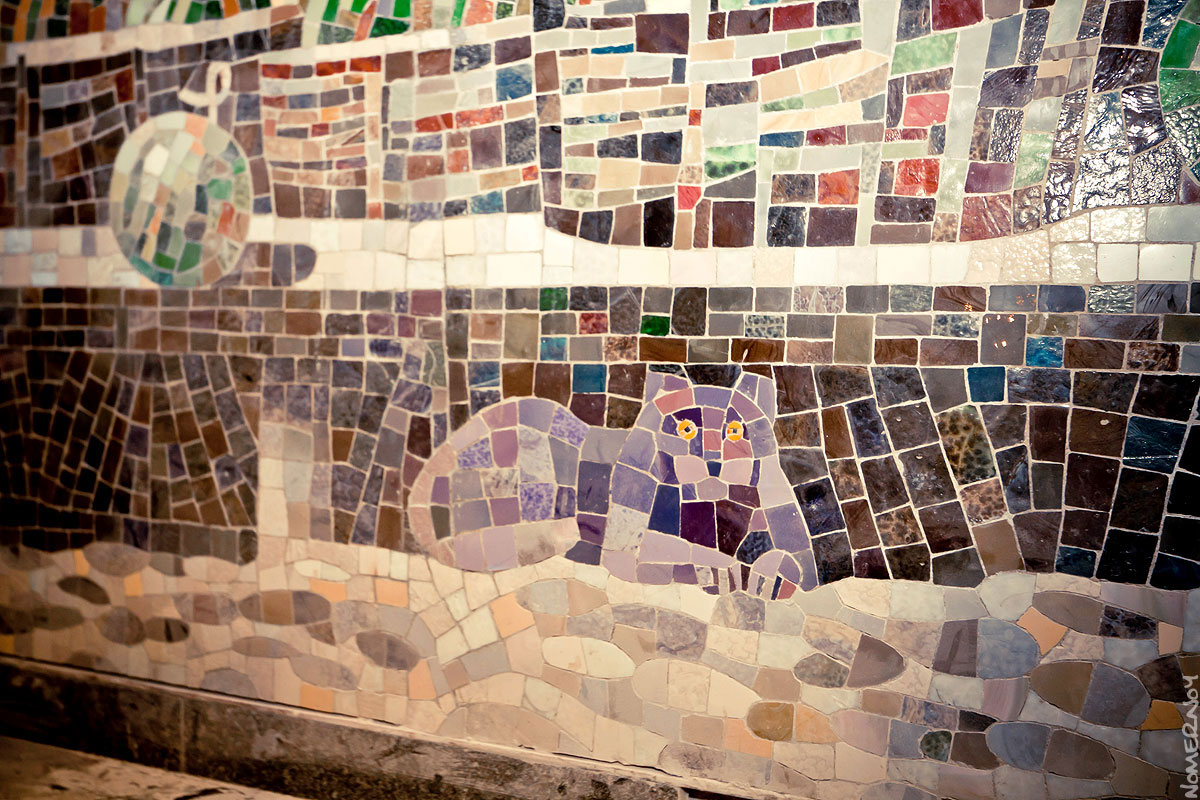 На полу и стенах - желтый камень и белый мрамор из Греции, черный и коричневый гранит из Финляндии. С одной стороны - заграничная роскошь, с другой - историческая правдоподобность. С мозаичных панно за посетителями наблюдают литературные герои из прошлой жизни Сенной площади - торговцы, домохозяйки. Среди них виден профиль Гоголя и борода Толстого, сутулая спина Раскольникова и шапка Филиппка. Антураж попытались сделать народным. Даже пол обещали не натирать, чтобы не было так скользко, как в других вестибюлях.