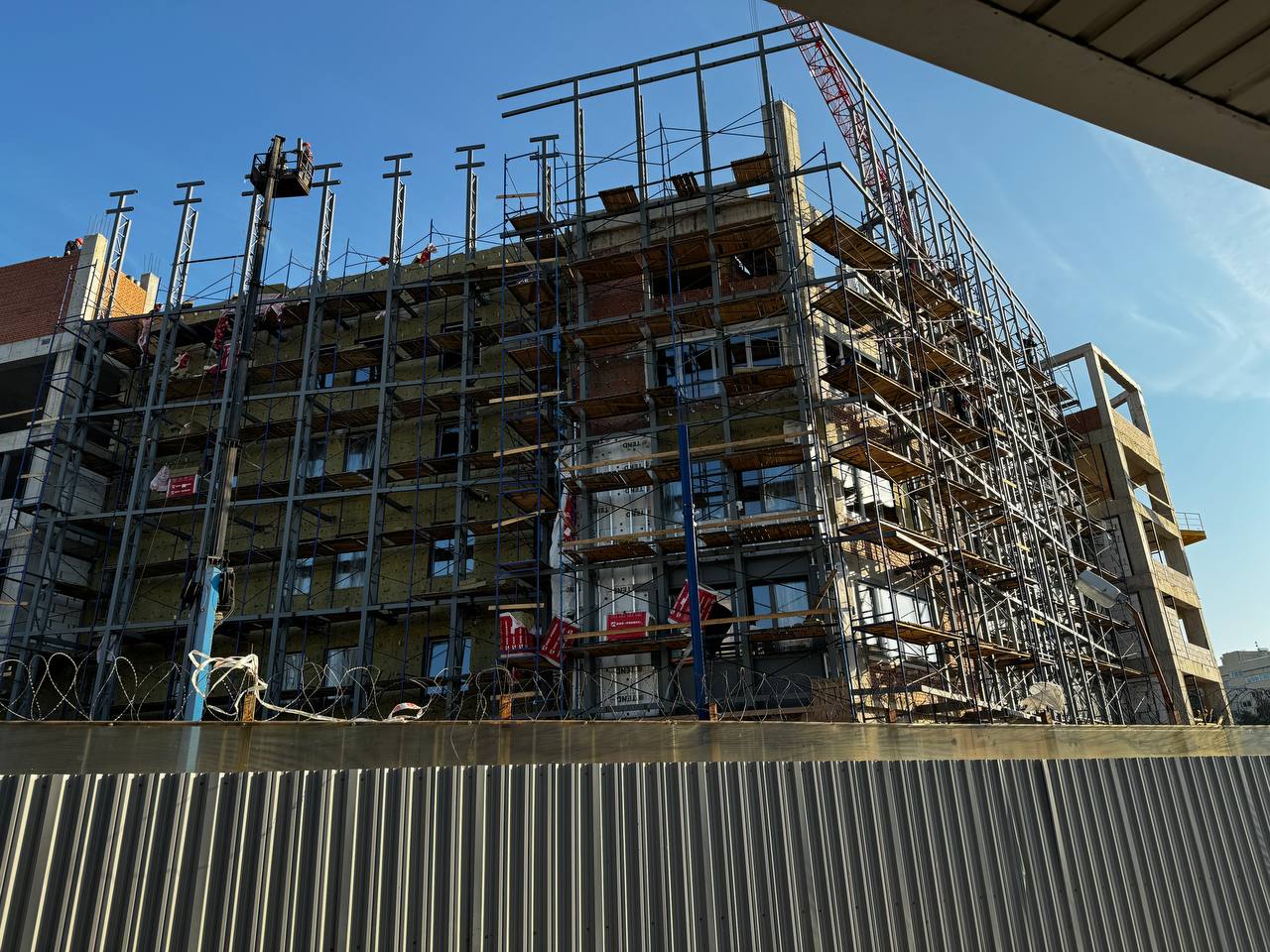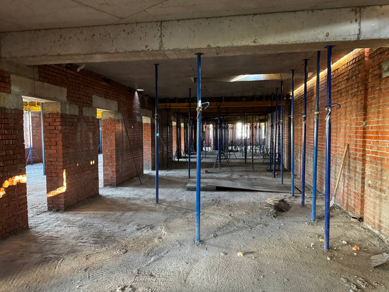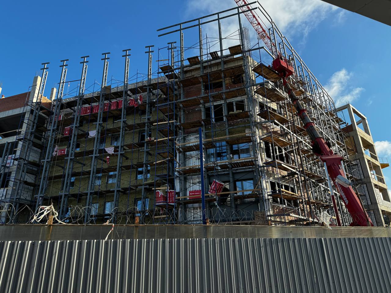 Стены здания достигли верхнего перекрытия 5 этажа, часть этого перекрытия уже забетонирована, а остающаяся часть армируется.