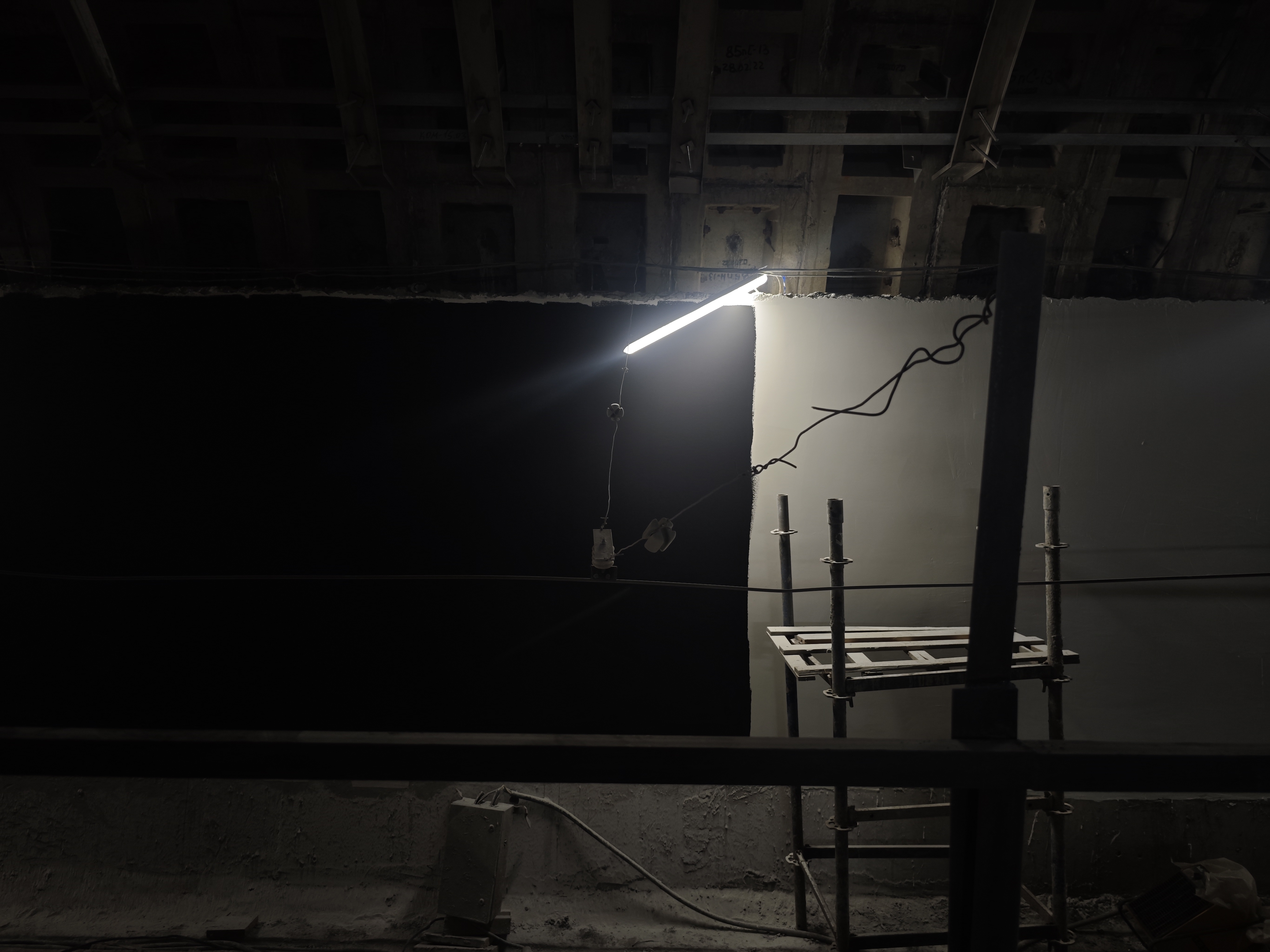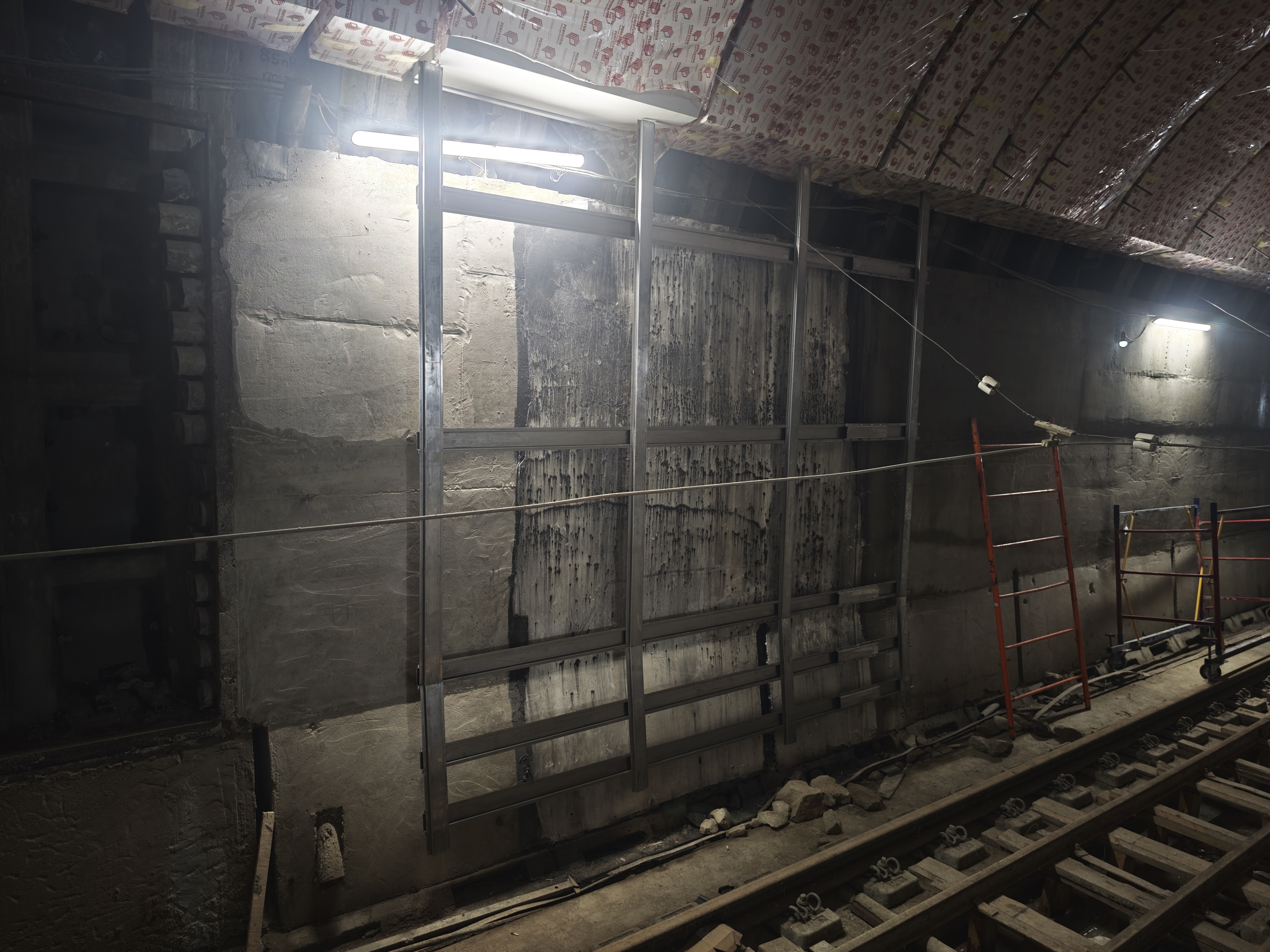 Поиск решения отделки путевой стены. В ПСТ смонтировали каркас на путевую стену, в ОСТАЛЬНОМ затукатурили, зашпаклевали и покрасили в чëрный цвет.