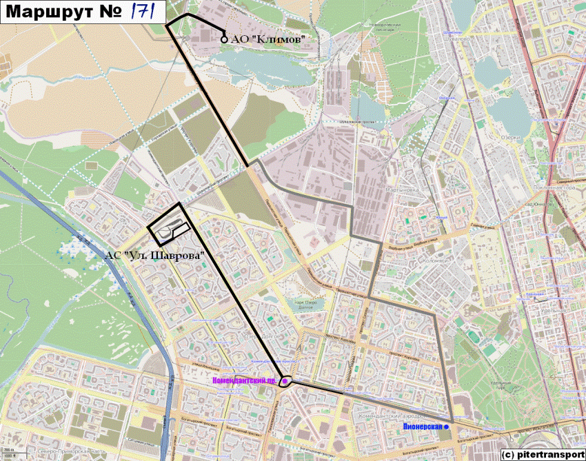 Об изменении трассы маршрута №171 сообщает «Пассажиравтотранс». Как рассказали в пресс-службе предприятия, для улучшения транспортного обслуживания населения с сегодняшнего дня будет продлена трасса маршрута № 171 «Коломяги, Ново-Никитинская улица – станция метро «Комендантский проспект»». Начальным и конечным пунктом маршрута станут проезд к ОАО «Климов» и остановка «Улица Шаврова» соответственно.