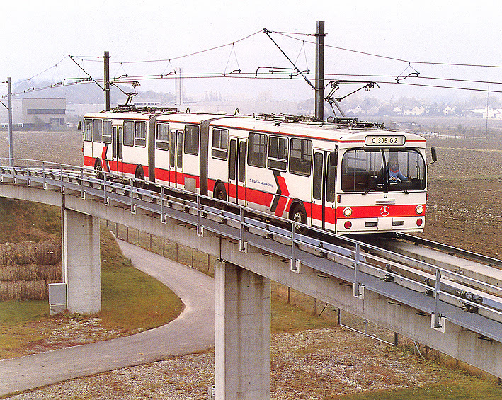 Идеальным был бы вариант по выделенке, но без прицепа, типа O-Bahn http://en.wikipedia.org/wiki/O-Bahn_Busway (небольшая вместимость, но зато чаще, чем огромная колбаса в интервале раз в полчаса...)