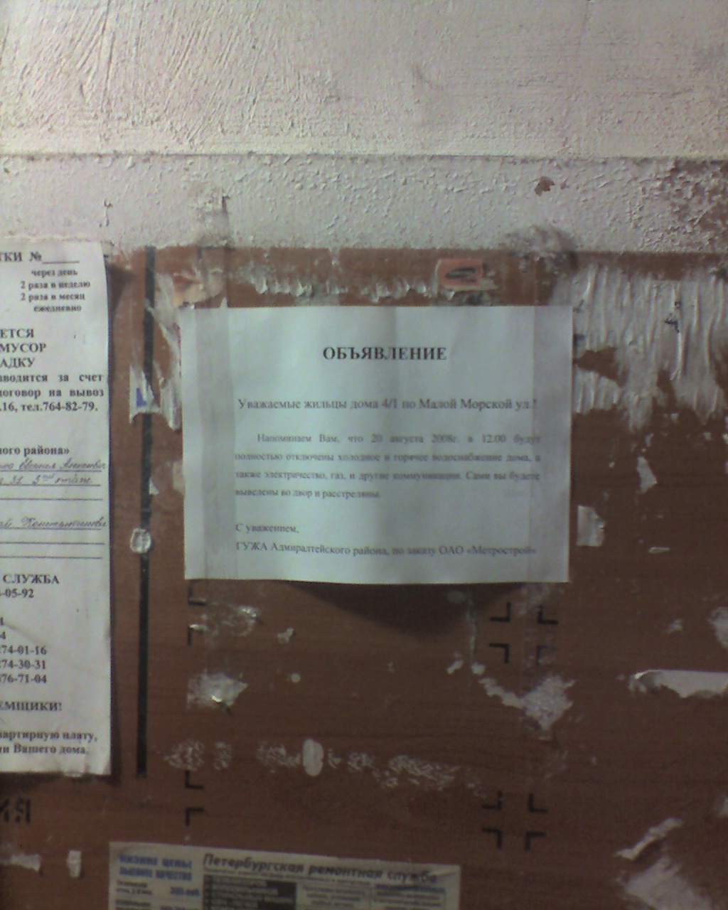 В подворотне и в парадных висят объявления от жилкомсервиса про надвигающееся 20 число и расселения. Еще есть вот такие объявы висят в некоторых парадных и в подворотне.