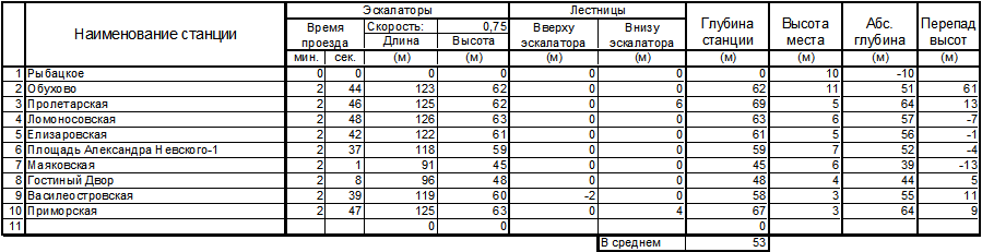 Ваши данные очень близки к моим оценкам глубин (по балюстрадам). Единственное систематическое отличие относится к станциям с наиболее длинными эскалаторами. По моим подсчетам, многие станции: Площадь Мужества, Политехническая, Академическая, Черная Речка, Пионерская, Удельная, Озерки, Ладожская, Обухово и т.д. - имеют эскалаторы одинаковой высоты - 65 метров. Впрочем, расхождение данных может быть связано с погрешностью измерений. Да и временная шкала чуть-чуть, но не совсем пропорциональна высотной - из-за скруглений эскалаторов на концах.