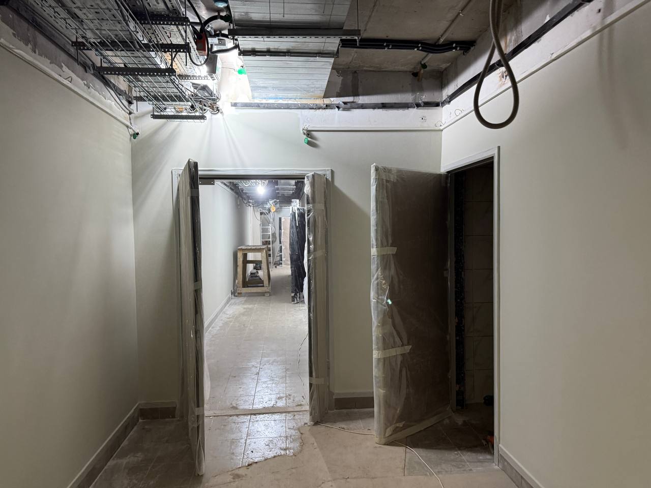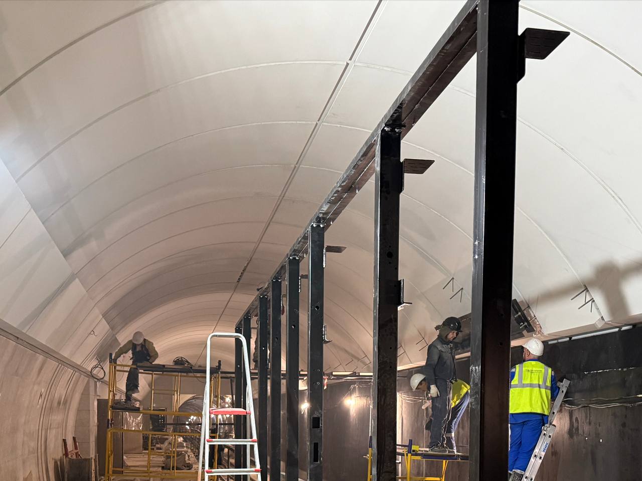 Продолжается установка каркаса станционных дверей.