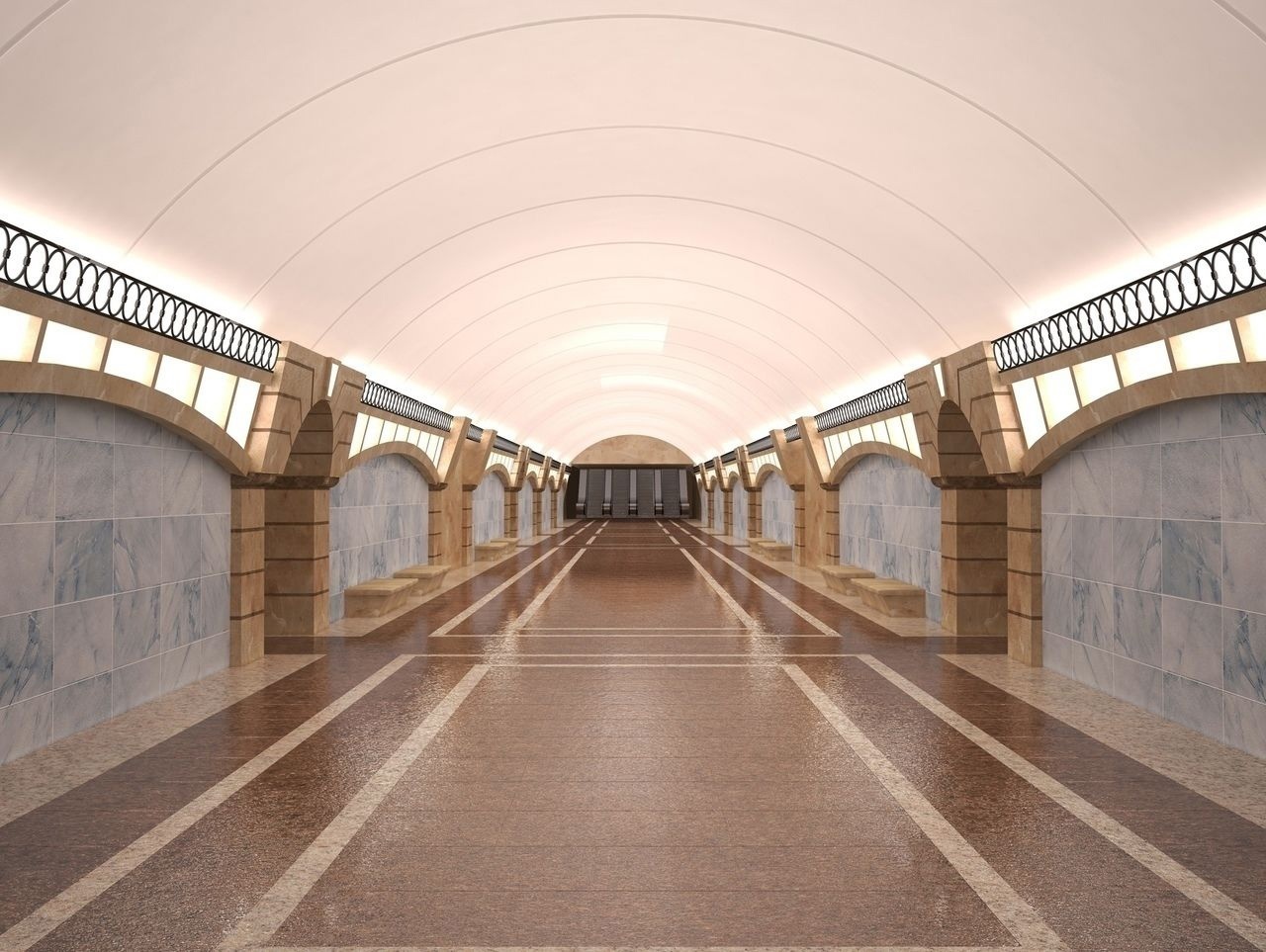 Надо учесть что на фото мрамор в оформлении колонн практически черный и зелёного там не просматривается. Следовательно скорее всего станция получится более черной чем на новом рендере.