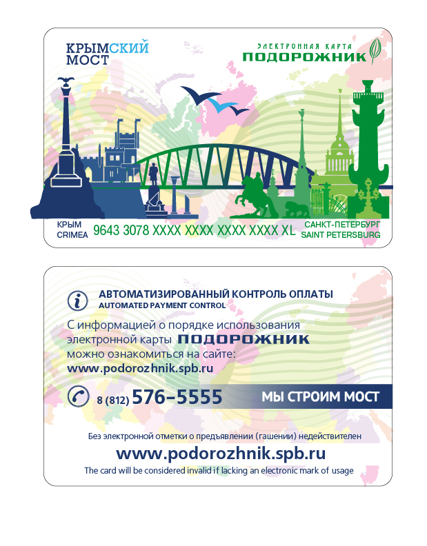С 04.11.2016 года пассажиры Петербургского метрополитена смогут приобрести новые электронные карты «Подорожник» с символикой «Крымский мост». Карты выполнены в 12 различных видах дизайна.