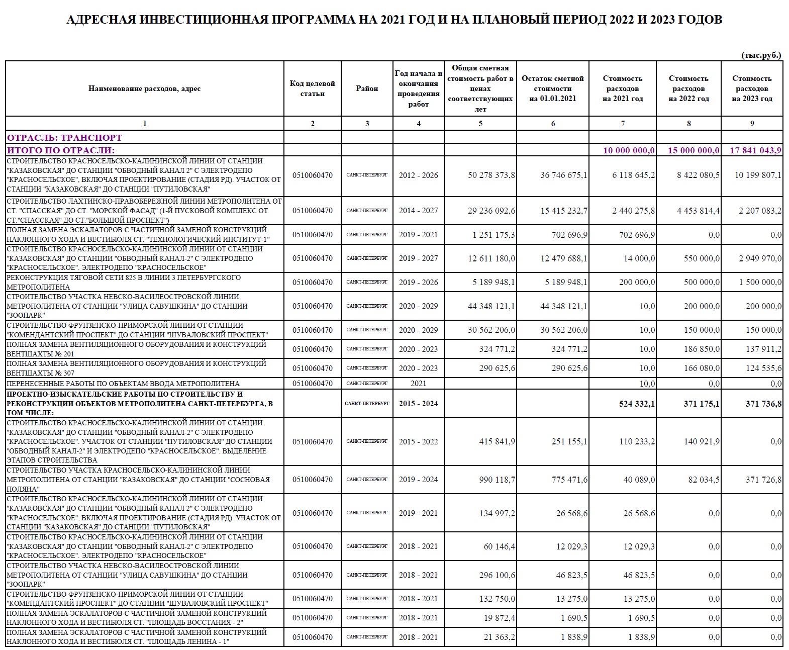 Вот как сейчас выглядит проект АИП (на сайте КРТИ) на 2021-2023 годы в части метрополитена: