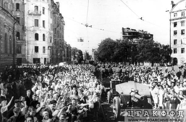 Из того же источника (то бишь из центрального гос. архива СПб.) - фото 1945 года нынешнего района Петроградской. Оригинальное название фото: Торжественная встреча воинов - победителей на Кировском проспекте. !945 год, автор - Д.М.Трахтенберг.