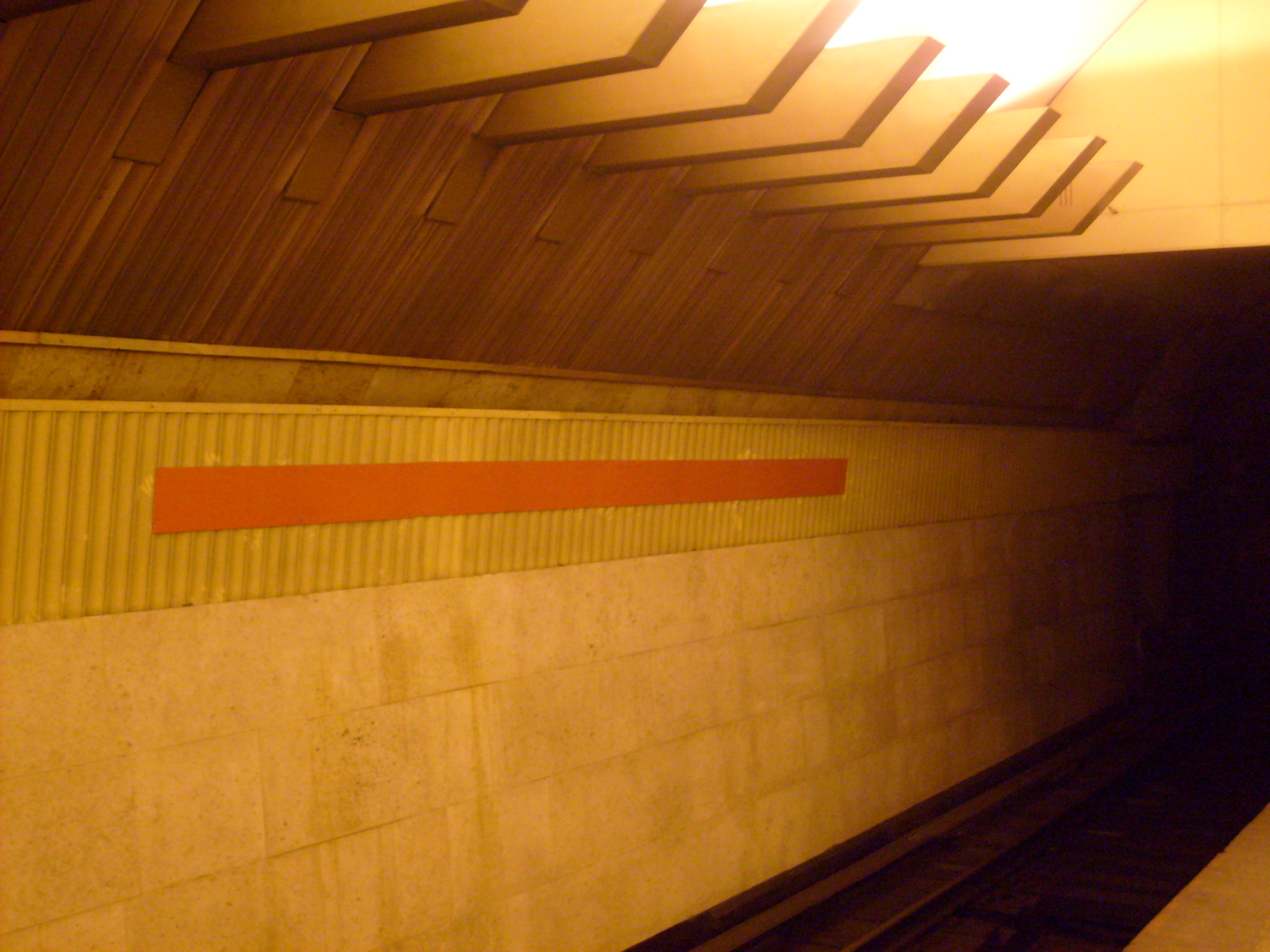 Это ещё не разгул. Хотите разгул? Сейчас получите. Так вот, полоса из металлических реек, уже изуродованная при ремонте путевых стен (напомню: рейки были анодированные под медь и при ремонте их, недолго думая, закрасили), сейчас повторно красится жёлтой краской. Причём заметно, что красится фигово - кисточкой, с заляпыванием других частей путевой стены. Только после этого совершенно непонятного действа на рейки наносится красная НИПовская пластиковая хренотень, причём не как на других станциях (парой шурупов по краям), а серьёзно так (4 шурупа по углам + несколько в середине, и так на каждый кусок пластика, а они короткие). Это уже не разгул вандализма, а просто вакханалия. Впрочем, над станцией и так уже надругались, как над уличной девкой - чего дальше-то терять? Видимо, таково мнение тех бездарей, которые работают над технической стороной НИПа.