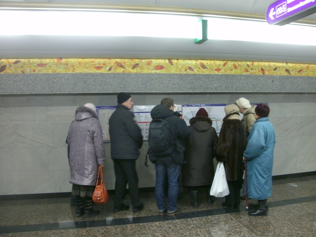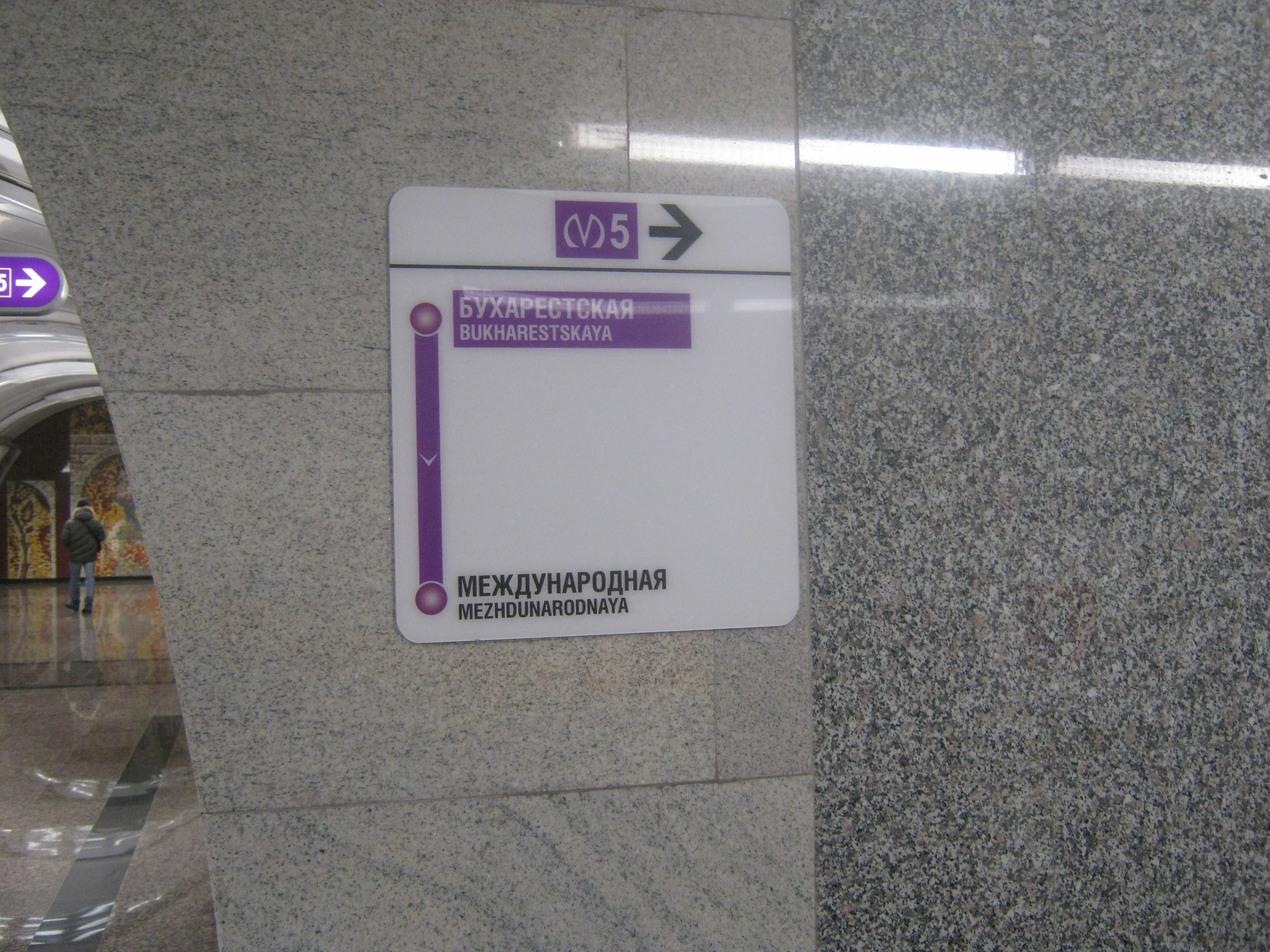 На Бухарестской, когда я туда попал, народу было гораздо меньше по сравнению со следующей Международной. Сравнивать обе станции между собой как-то не очень выходит, можно только заметить, что здесь отделка стен более продумана, с полоской мозаики. Ну синичка там, которую я даже потрогал. Центральный зал предсказуемо скромен по размеру. Мозаика в торце действительно самое популярное место, хотя дверка там и впрямь заклеена глянцевой картинкой. Но вестибюльная ИМХО гораздо лучше. Сам вестибюль внутри показался наряднее платформы. Только вход, на мой взгляд, расположили неправильно, от улицы он расположен на расстоянии. Светящийся кубик с логотипом там поставили далеко от входа, и да, совершенно зря так сделали. Как пить дать, обвандалят.
